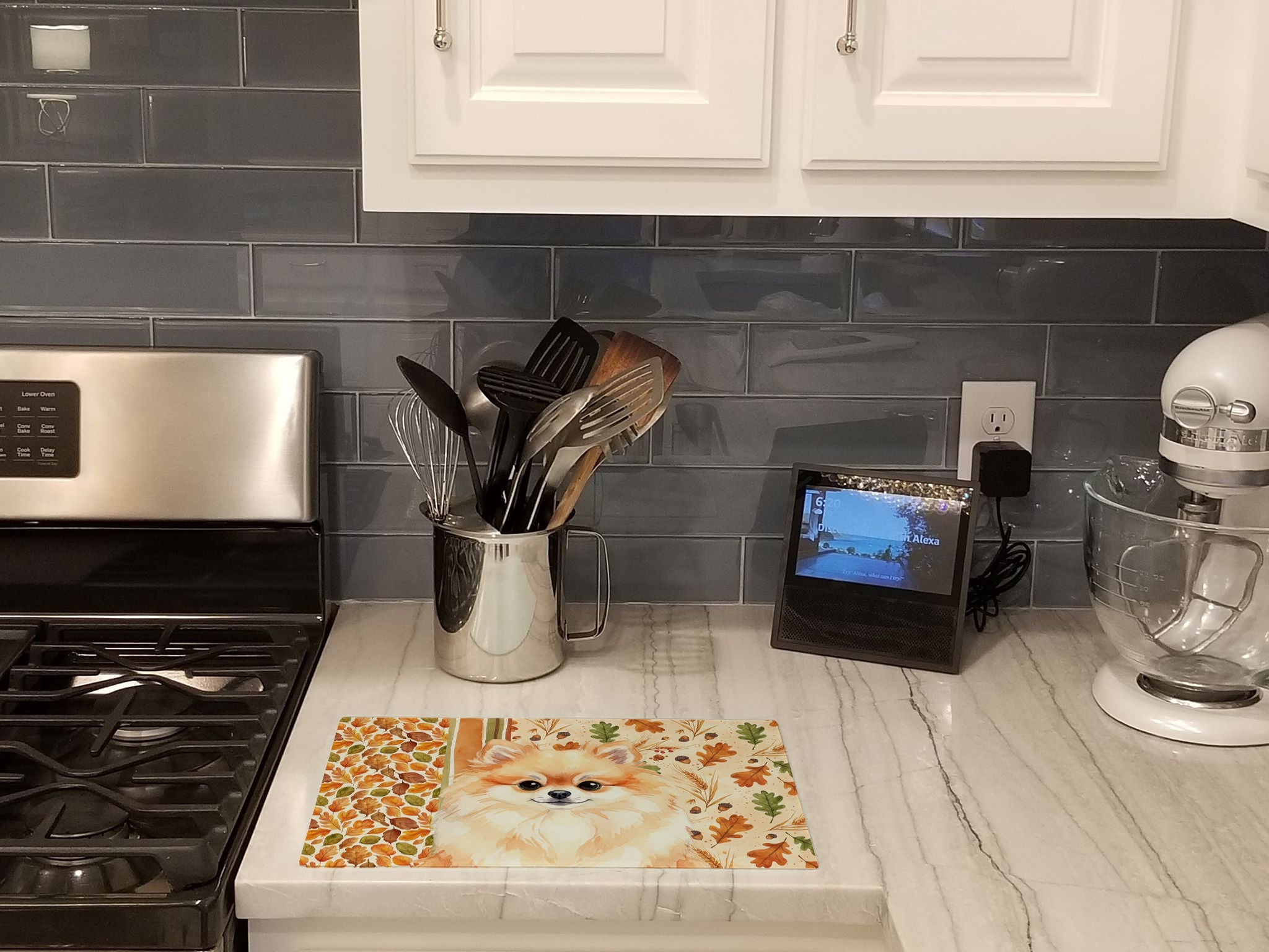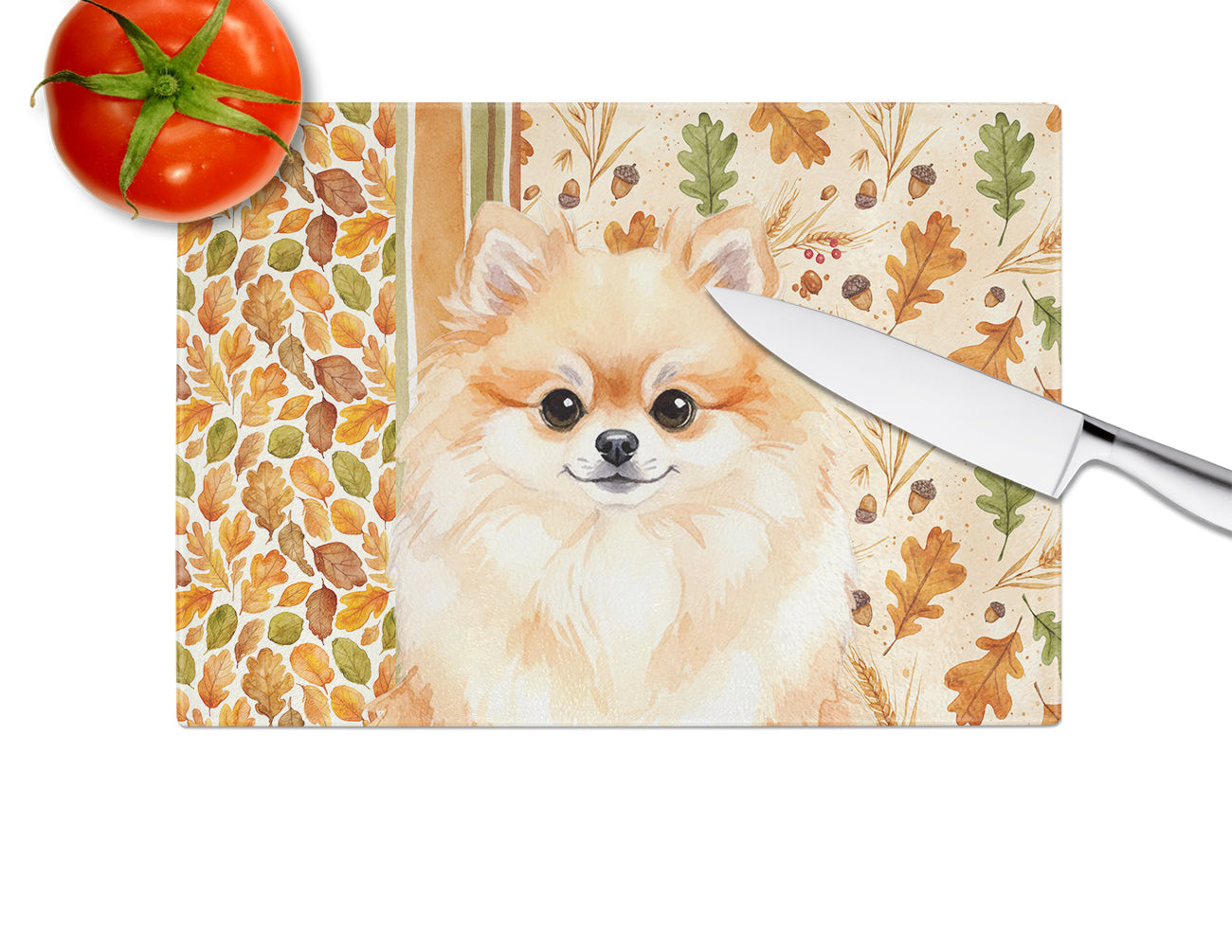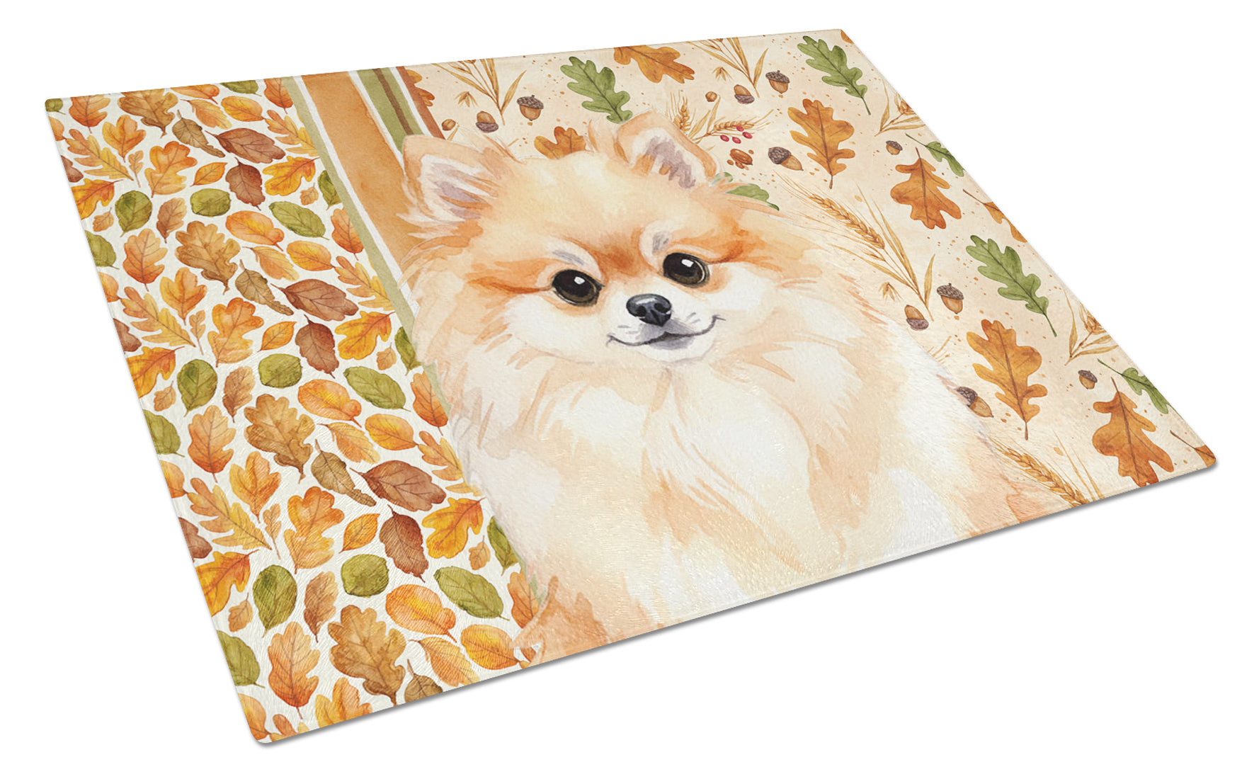 Glass Cutting Board featuring breed specific Pomeranian artwork. Celebrate Thanksgiving with this Thanksgiving Cutting Board. Introduce your kitchen to the vibrant, large Decorative Glass Cutting Board from Caroline's Treasures. Crafted from resilient tempered glass, this board is not only a utilitarian necessity but also a colorful art piece. With its generous dimensions of 15 inches in height and 12 inches in length, it offers ample space for all your cutting needs. Every piece showcases captivating artwork from distinguished artists, bringing an aesthetic edge to your kitchen. Beyond its attractive design, this cutting board ensures your countertop stays pristine and unscathed, owing to its heat-resistant properties. Engineered with user convenience in mind, it features non-skid feet for stability, and rounded corners for additional safety. Its robust construction renders it virtually unbreakable, guaranteeing longevity. The board comes with protective feet bumpers, maintaining its position during use. This product is recommended to be hand washed only. Proudly printed and assembled in the United States, this cutting board exemplifies superior craftsmanship. With Caroline's Treasures' Decorative Glass Cutting Board, you're investing in a blend of functionality and artistic flair.