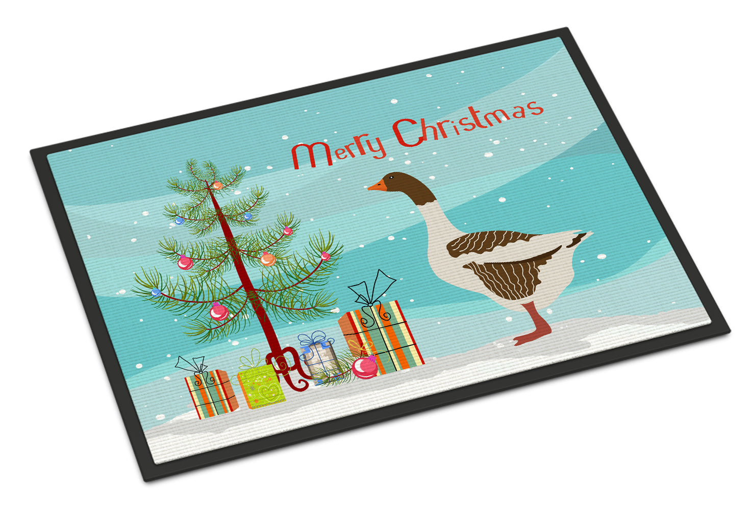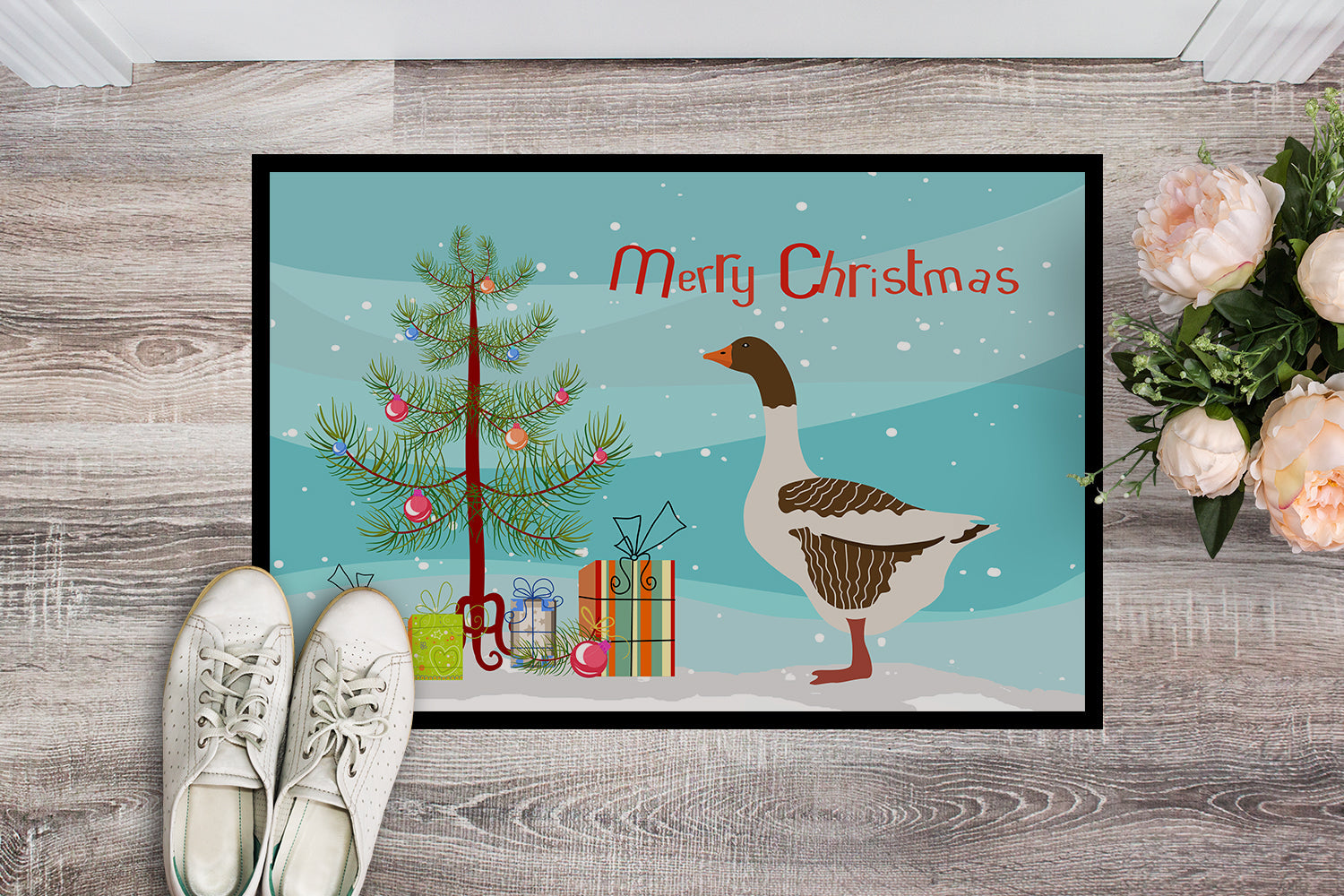 Decorate your space with our Christmas Pomeranian Rogener Goose artwork on a Doormat. Welcome your guests in style with our Artwork Door Mat, designed to withstand almost any weather condition. This mat, measuring approximately 18 by 27 inches, is held together by durable black binding tape. Its top layer, composed of polyester felt, is dyed with the eye-catching image you see on the mat. A few layers below provide the mat with stability, while its rubber bottom is stamped to help prevent slipping and ensures safety. Our mat works wonderfully as both an indoor or outdoor door mat. For cleaning, simply hose it off with water or use a power washer - no need for any cleaner that produces suds. Avoid scrubbing with a brush, instead, opt for the vacuum on floor setting. Designed manufactured and printed in the USA, this mat is a perfect addition to your porch, outdoor kitchen, entryway, or any indoor space. Its unique design makes it a charming decorative rug that greets your guests and adds a stylish touch to your home decor.