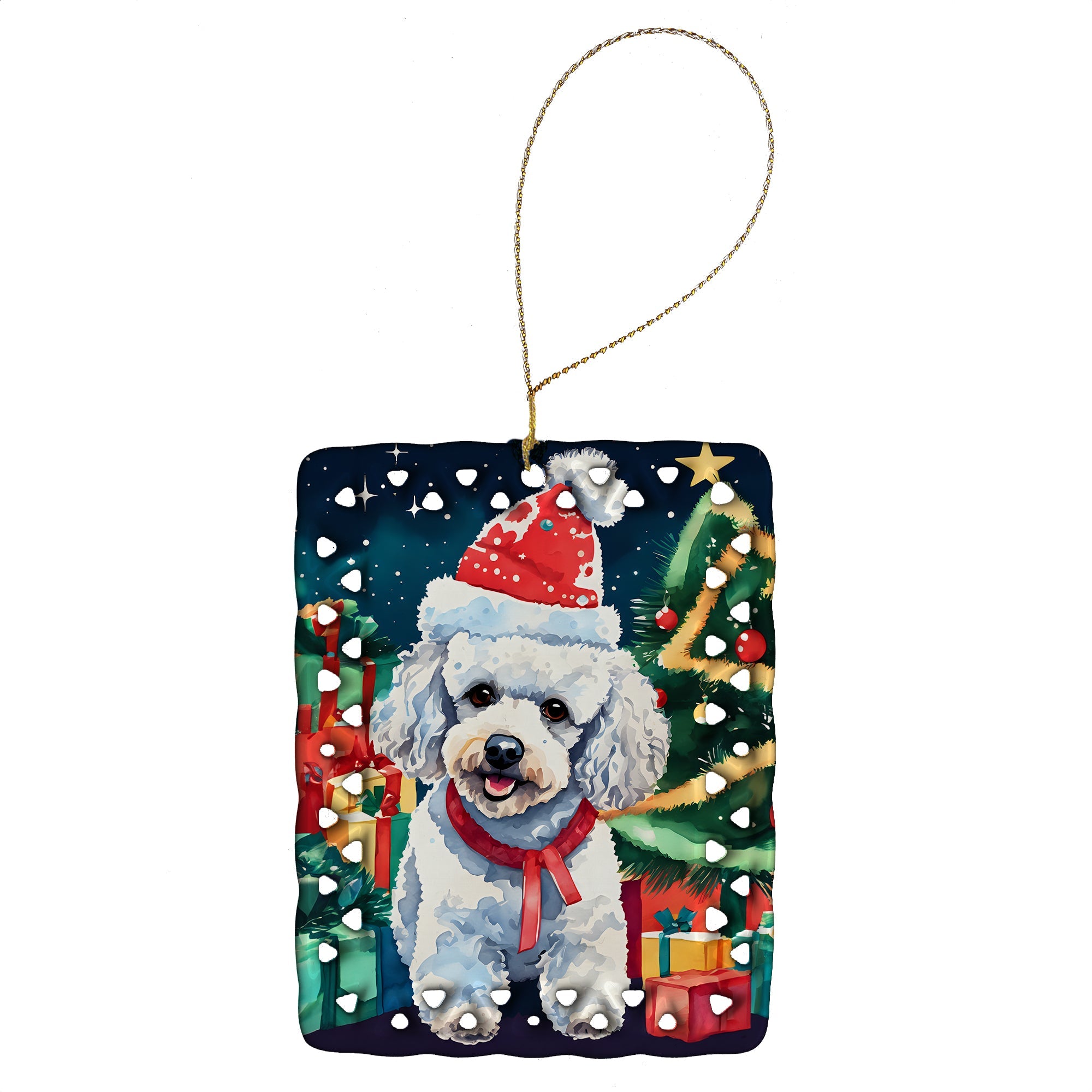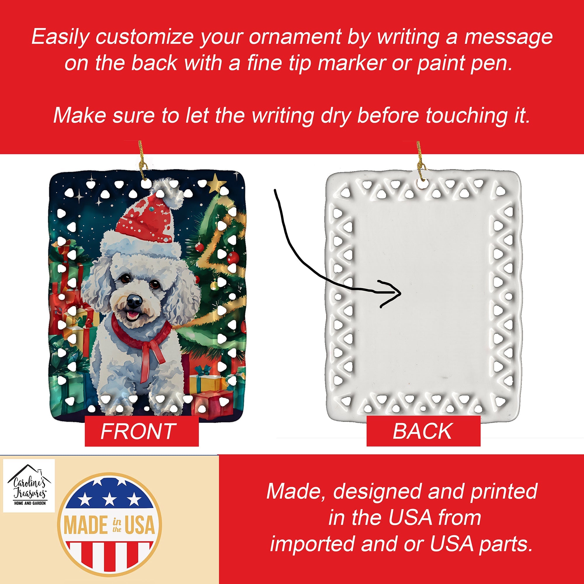 Porcelain Ornament featuring breed specific Poodle artwork. Celebrate Christmas with this Christmas Ornament. Add a unique, personal touch to your holiday decor with our Rectangular Lattice Porcelain Ornament. Perfect for creating cherished memories, this high-quality ornament shines under festive lights, reflecting warmth and joy throughout your Christmas tree. Crafted with a glossy finish, it showcases vibrant, full-color artwork contributed by our talented artists, ensuring your tree is adorned with a burst of color and holiday spirit. What sets this Porcelain Ornament apart is its customizable white back. Use a paint pen or permanent marker to write a heartfelt message, commemorate a special year, or mark an unforgettable date, turning this ornament into a keepsake that will be treasured for years to come. For best results, allow any personalization to dry thoroughly before handling. Each ornament comes complete with a delicate gold cord, making it easy to hang and display. Proudly made in the USA, this ornament measures 3.375 x 2.625 inches and is a thoughtful gift for pet sitters, teachers, family members, or anyone who would appreciate a little extra holiday magic. Bring style, charm, and a touch of personal meaning to your Christmas tree with this beautifully designed ornament..