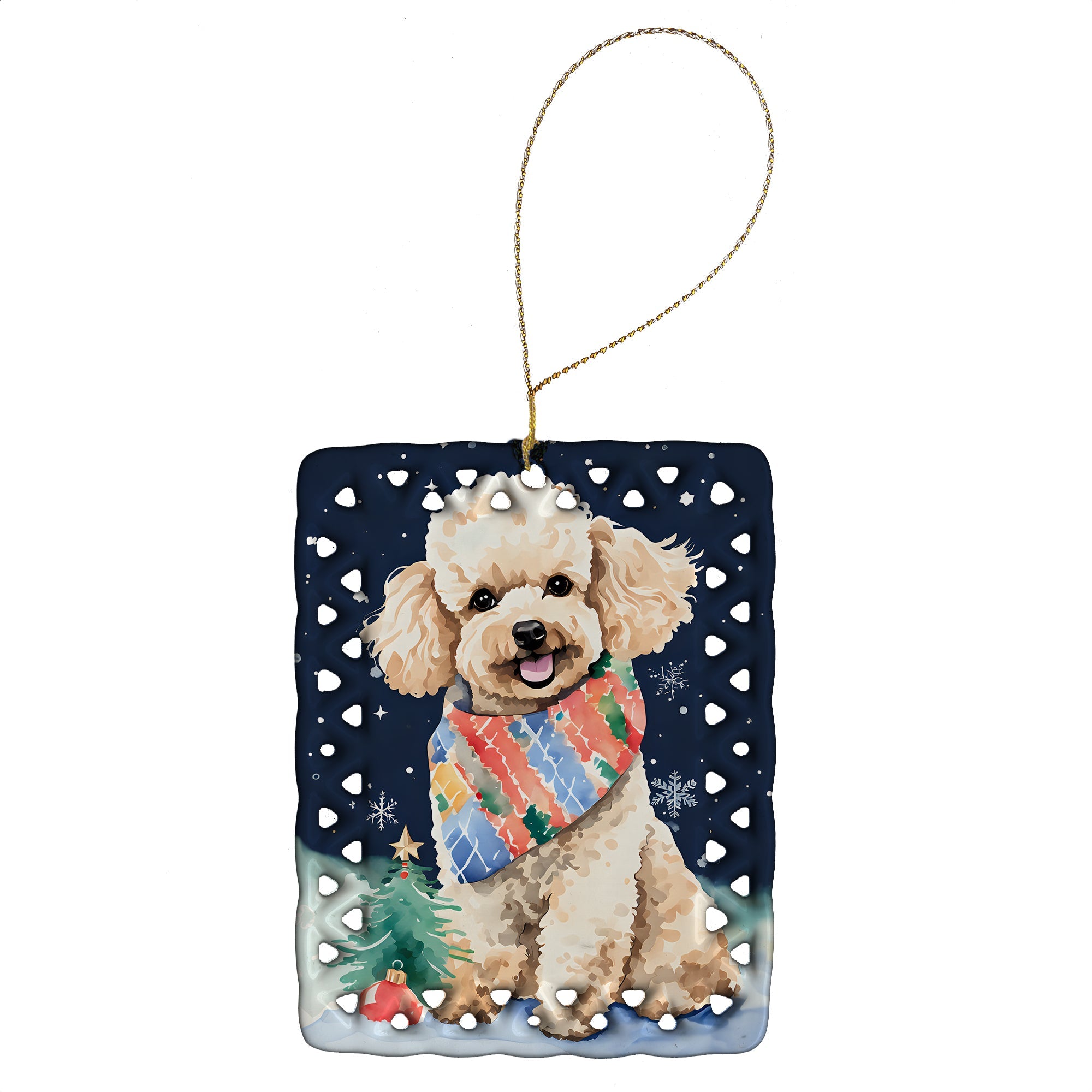 Porcelain Ornament featuring breed specific Poodle artwork. Celebrate Christmas with this Christmas Ornament. Add a unique, personal touch to your holiday decor with our Rectangular Lattice Porcelain Ornament. Perfect for creating cherished memories, this high-quality ornament shines under festive lights, reflecting warmth and joy throughout your Christmas tree. Crafted with a glossy finish, it showcases vibrant, full-color artwork contributed by our talented artists, ensuring your tree is adorned with a burst of color and holiday spirit. What sets this Porcelain Ornament apart is its customizable white back. Use a paint pen or permanent marker to write a heartfelt message, commemorate a special year, or mark an unforgettable date, turning this ornament into a keepsake that will be treasured for years to come. For best results, allow any personalization to dry thoroughly before handling. Each ornament comes complete with a delicate gold cord, making it easy to hang and display. Proudly made in the USA, this ornament measures 3.375 x 2.625 inches and is a thoughtful gift for pet sitters, teachers, family members, or anyone who would appreciate a little extra holiday magic. Bring style, charm, and a touch of personal meaning to your Christmas tree with this beautifully designed ornament..