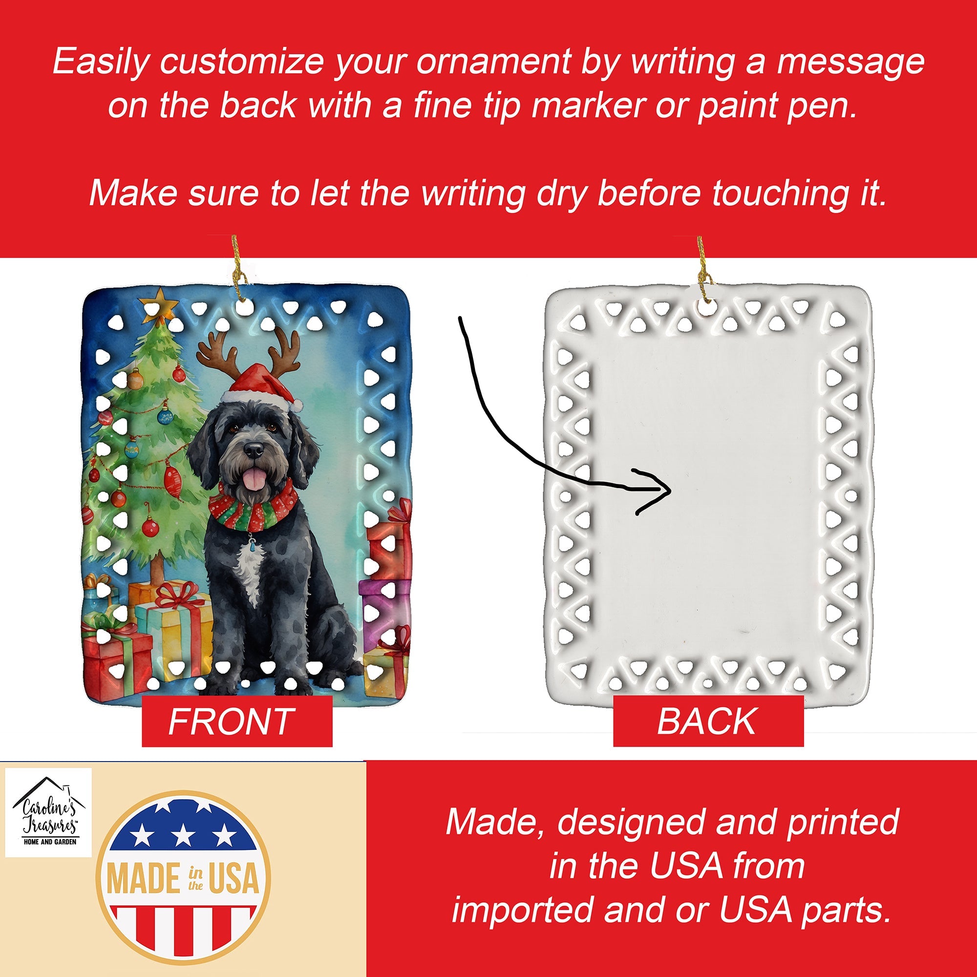 Porcelain Ornament featuring breed specific Portuguese Water Dog artwork. Celebrate Christmas with this Christmas Ornament. Add a unique, personal touch to your holiday decor with our Rectangular Lattice Porcelain Ornament. Perfect for creating cherished memories, this high-quality ornament shines under festive lights, reflecting warmth and joy throughout your Christmas tree. Crafted with a glossy finish, it showcases vibrant, full-color artwork contributed by our talented artists, ensuring your tree is adorned with a burst of color and holiday spirit. What sets this Porcelain Ornament apart is its customizable white back. Use a paint pen or permanent marker to write a heartfelt message, commemorate a special year, or mark an unforgettable date, turning this ornament into a keepsake that will be treasured for years to come. For best results, allow any personalization to dry thoroughly before handling. Each ornament comes complete with a delicate gold cord, making it easy to hang and display. Proudly made in the USA, this ornament measures 3.375 x 2.625 inches and is a thoughtful gift for pet sitters, teachers, family members, or anyone who would appreciate a little extra holiday magic. Bring style, charm, and a touch of personal meaning to your Christmas tree with this beautifully designed ornament..