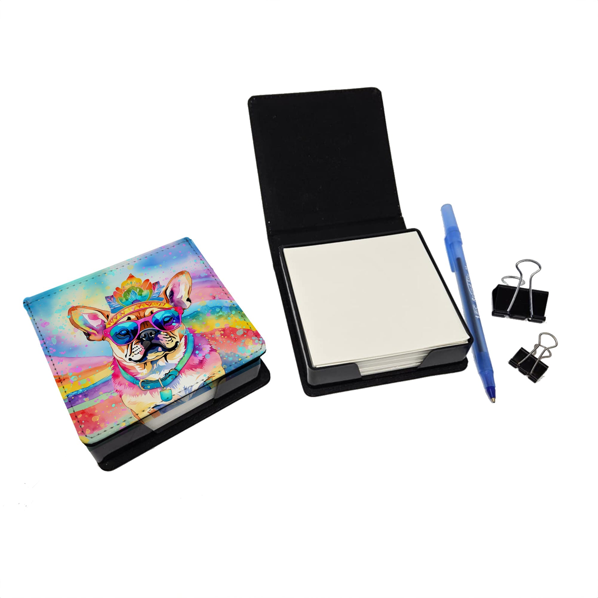 PU Leather Note Paper Holder featuring breed specific Pug artwork. Elevate your workspace with this PU Leather Note Paper Holder, crafted to resemble luxurious leather without the use of animal products. Made from durable synthetic PU leather, it offers both a premium look and eco-friendly appeal. This note holder, compactly sized at 4.25 x 4.25 x 1.25 inches, includes about 160 sheets of 3.75 x 3.75-inch note paper—ideal for quick notes and reminders. An exclusive artist-designed cover makes each holder uniquely vibrant, adding a splash of color and personality to any desk or office. The discrete design keeps note paper hidden, maintaining a neat and organized workspace. Perfect as a gift or for personal use, this stylish holder is refillable with standard paper, ensuring long-lasting utility. A must-have for anyone seeking a sophisticated, artful touch to their workspace while supporting animal-friendly products. Add style, organization, and creativity to your everyday routine with this elegant note paper holder.
