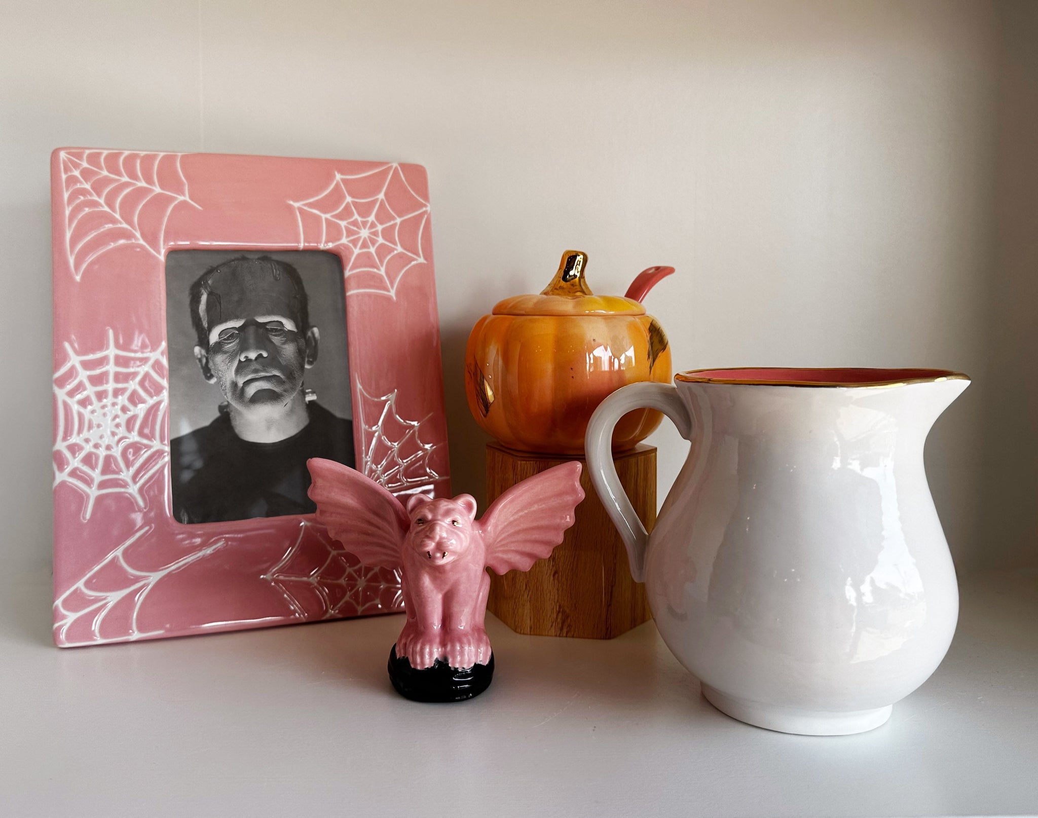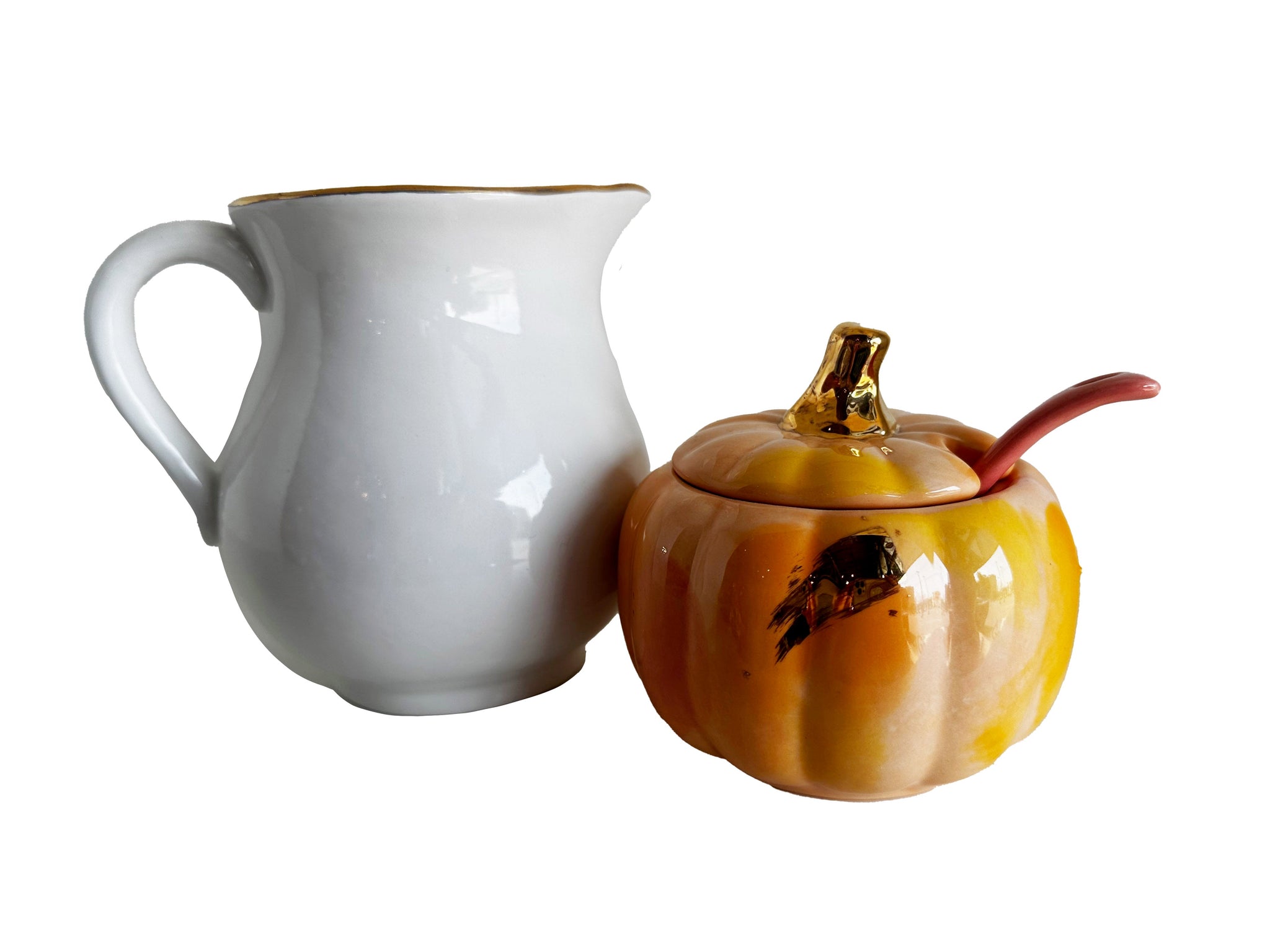 New for 2024! We've added a creamer companion to our lovely Pumpkin Sugar Pot! Select a white creamer with a coordinating pink interior and gold rim, or a black creamer with a purpler interior and silver rim.