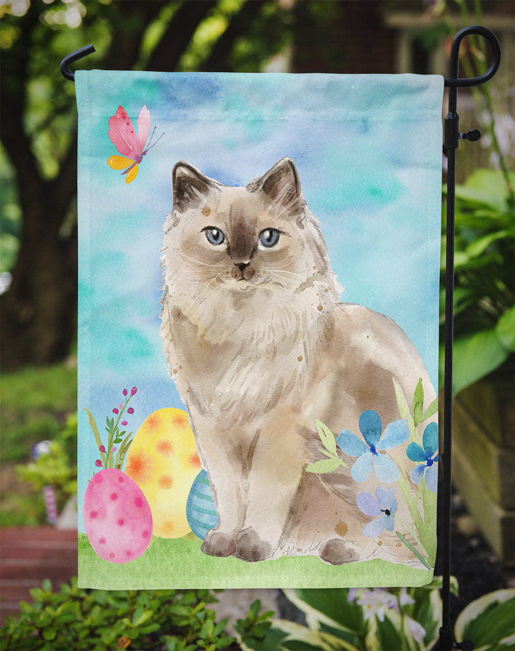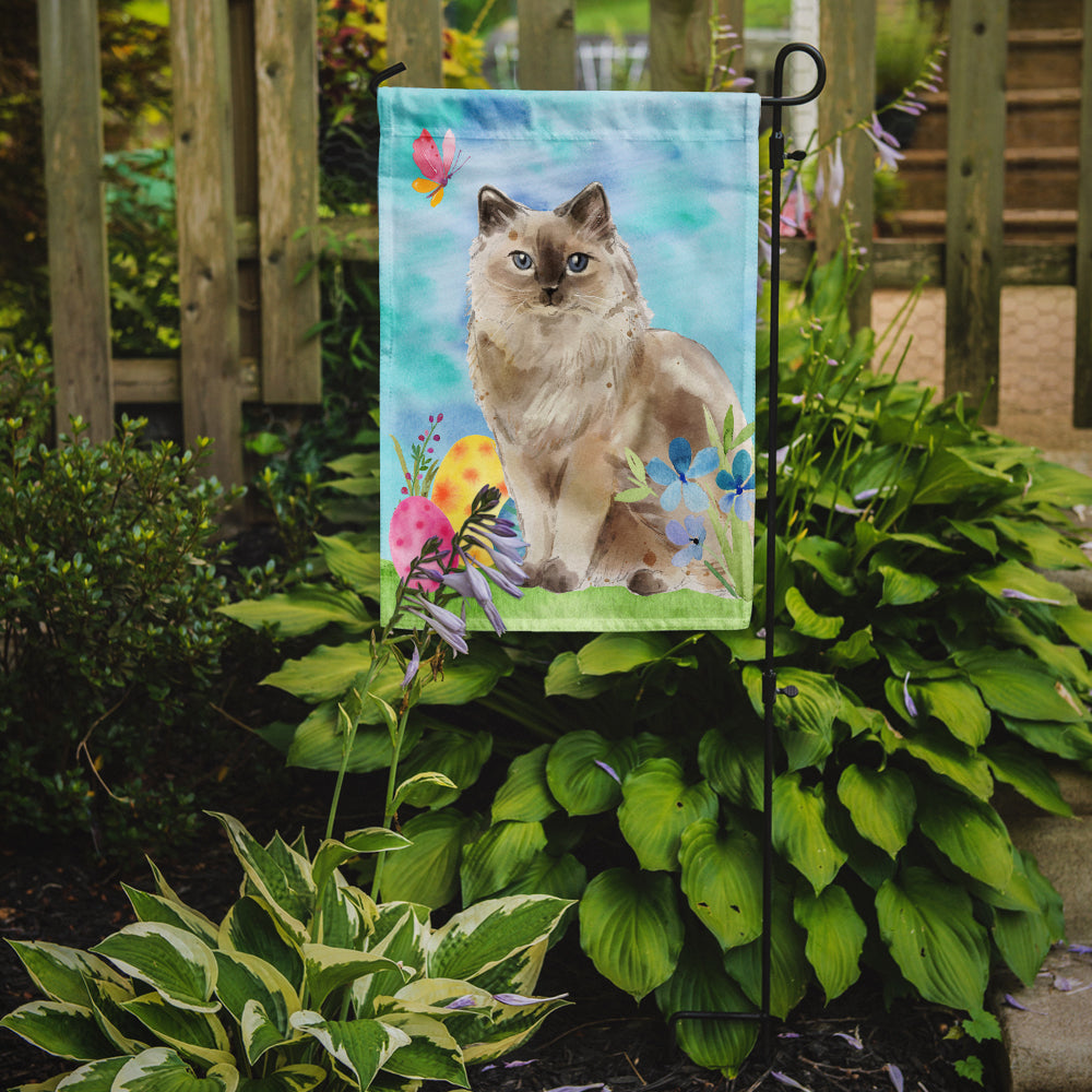 Decorate your space with our Easter Ragdoll artwork on a Garden Flag. Enhance the beauty of your garden, patio, or yard with Caroline's Treasures Decorative Garden Flag, proudly made in the USA. Crafted from two pieces of thick, double-sided polyester fabric, this 2-ply garden flag is designed to withstand various weather conditions, making it water-resistant and weatherproof. Featuring correctly readable words on both sides, this garden flag offers a delightful visual experience from any angle. With its heavier weight, it stands out among other garden flags, ensuring stability and durability even in wind, rain, and snow. Measuring approximately 11 1/4 inches by 15 1/2 inches, this flag allows you to personalize your outdoor decor. It comes with a 1 1/2-inch sleeve sewn in, allowing easy attachment to any standard garden flag stand or garden size porch hanger (sold separately). Make a statement in your outdoor space with Caroline's Treasures Decorative Garden Flag, a vibrant and high-quality flag that adds color and personality to your surroundings. Proudly made in the USA, it's a symbol of quality craftsmanship and attention to detail.