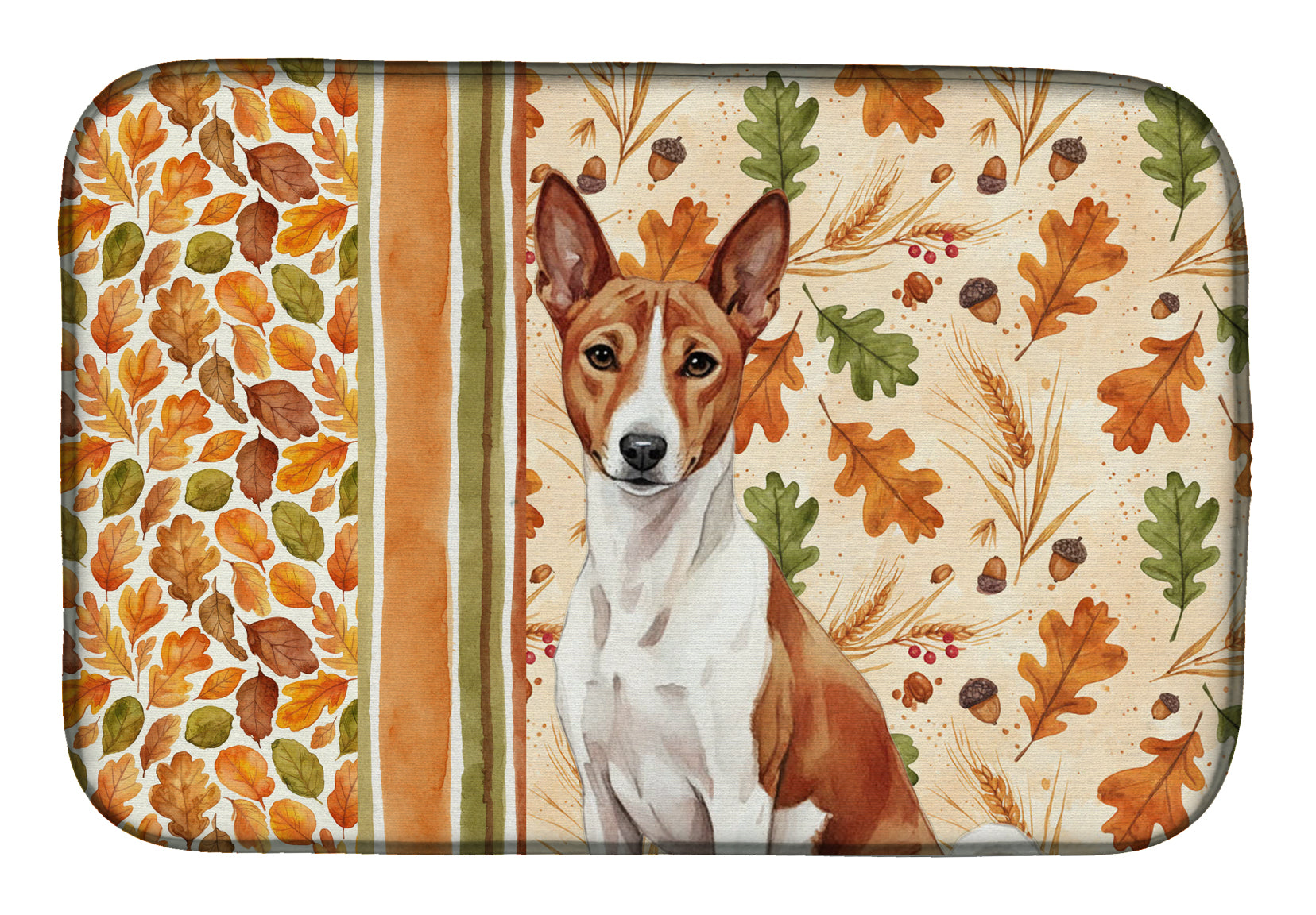Dish Drying Mat featuring breed specific Basenji artwork. Celebrate Thanksgiving with this Thanksgiving Dish Drying Mat. Say goodbye to messy countertops and soggy dish towels with our innovative dish drying mat. Our high-quality dish drying pad is designed to keep your countertops dry while offering a stylish and efficient solution. Whether you're air drying dishes, glasses, stemware, silverware, pots, pans, bottles, or even fruits and vegetables, our dish mat is the perfect choice. The 14 inches x 22 inches size fits most counters and dish drying racks, and the non-slip design ensures stability. Made with water-absorbent polyester and a polyurethane foam insert, our dish drying mat is not only functional but also durable. It's machine washable and printed in the USA for long-lasting use. The beautiful artwork adds flair to your kitchen decor, making it a perfect housewarming gift or present for any occasion. Upgrade your kitchen experience with our absorbent and versatile dish drying mat.