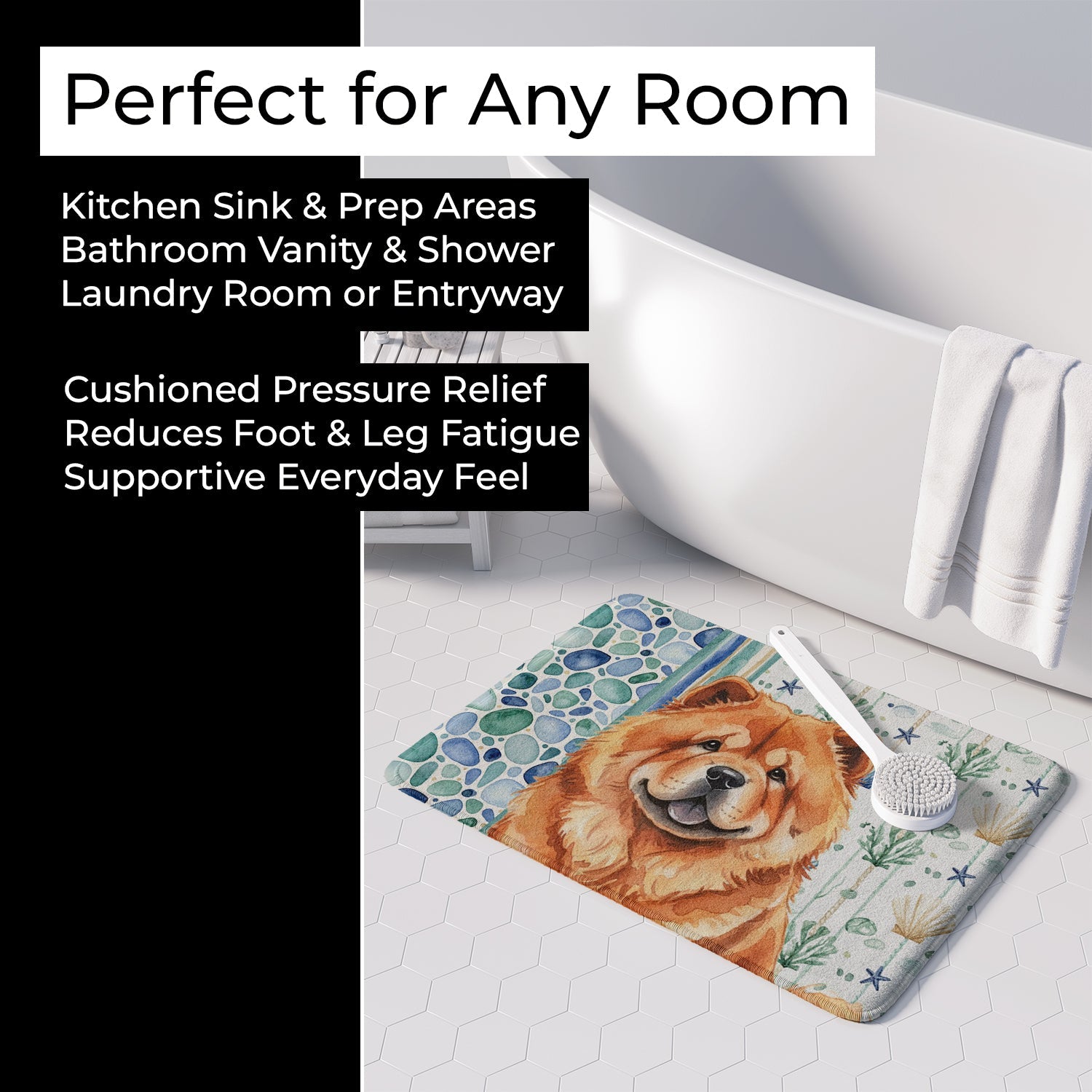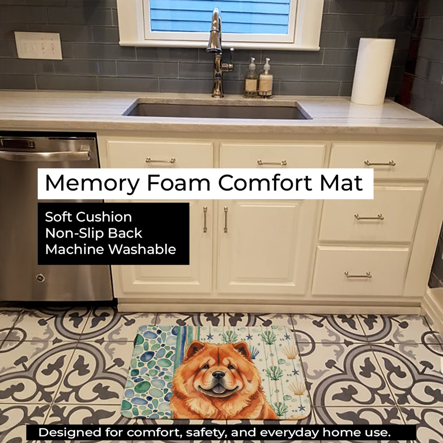 Shown here is the Red Chow Chow Coastal Sea Glass Memory Foam Kitchen Mat from Caroline's Treasures featuring artwork of a Chow Chow in a Everyday design. The detailed illustration and vibrant colors make it a standout accent that celebrates both seasonal style and love for the subject. This image features a calming coastal watercolor pattern with soft seashells, seaweed, starfish, and pebble-inspired accents arranged in a repeating design. The soothing palette of blues, greens, and sandy neutrals creates a relaxed, beach-inspired look that adds a fresh and tranquil feel to any space. Everyday décor celebrates personal style and the small moments that make a house feel like home. Thoughtful designs add warmth and personality that can be enjoyed year-round. Transform your floor into a work of art with Caroline's Treasures' Memory Foam Mat. This mat offers not only a stunning visual appeal but also a luxurious, plush feel that's incredibly comfortable to the touch. It's a versatile, machine-washable mat designed for both bath and kitchen use, ensuring you experience the best in comfort and convenience. Care Instructions: Maintaining this memory foam mat is a breeze. Simply follow the care instructions on the product tag. It's recommended to wash in cold water and dry on a low-temperature setting in the dryer. This ensures the mat retains its quality and longevity, allowing you to enjoy its beauty and comfort for a long time. Caroline's Treasures' Memory Foam Mat Machine Washable is the perfect blend of artistry, comfort, and practicality, making it a standout addition to any space. Upgrade your home decor with this versatile and stylish mat today. Chow Chows are dignified dogs known for their lion-like appearance and reserved temperament. This ancient breed is respected for its independence, loyalty, and calm presence. Makes a heartfelt gift for: Chow Chow owners, Dogs lovers, Everyday gifts, pet parents, friends who adore their Chow Chow, or anyone celebrating Dogs.