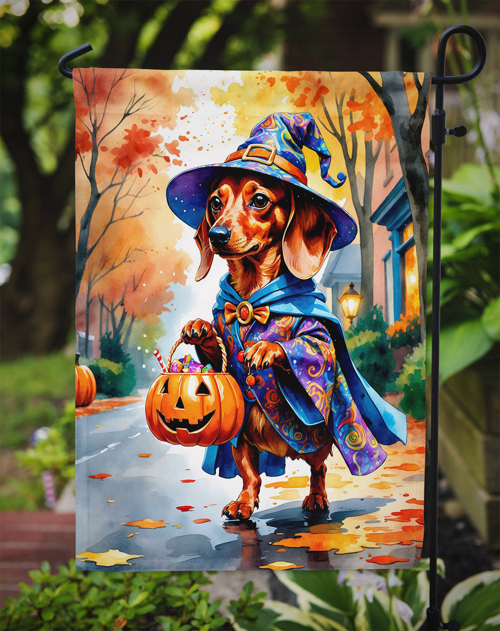 Red Dachshund Halloween Trick or Treat Garden Flag