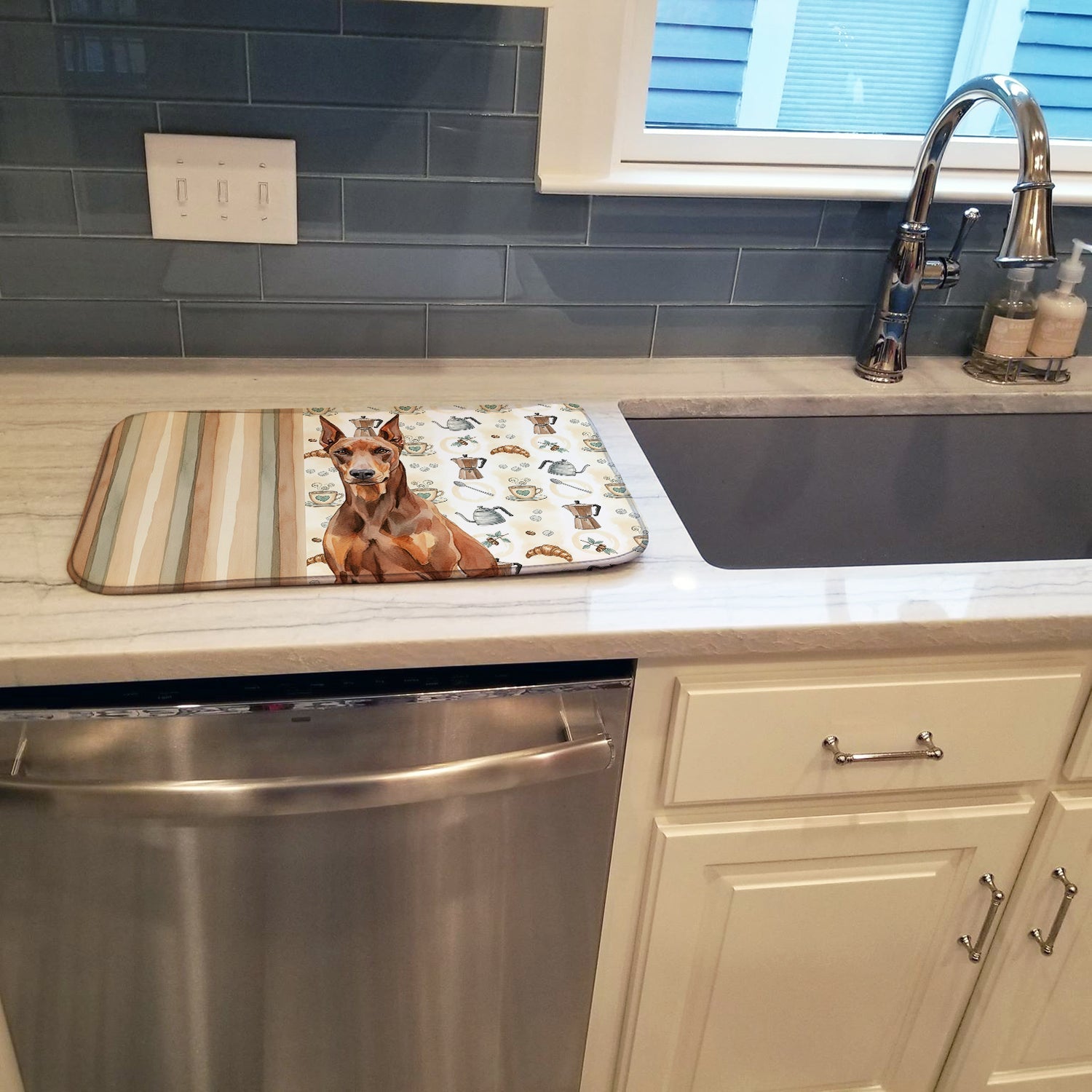 Shown here is the Red Doberman Pinscher Coffee Bar Dish Drying Mat from Caroline's Treasures featuring artwork of a Doberman Pinscher in a Everyday design. The detailed illustration and vibrant colors make it a standout accent that celebrates both seasonal style and love for the subject. This image features a cozy watercolor coffee-themed pattern with illustrated mugs, moka pots, kettles, croissants, coffee beans, and sugar cubes arranged in a repeating design. Soft neutral tones with warm browns, creams, and subtle sage accents create an inviting, café-inspired look that feels comforting and relaxed. Everyday décor celebrates personal style and the small moments that make a house feel like home. Thoughtful designs add warmth and personality that can be enjoyed year-round. Say goodbye to messy countertops and soggy dish towels with our innovative dish drying mat. Our high-quality dish drying pad is designed to keep your countertops dry while offering a stylish and efficient solution. Whether you're air drying dishes, glasses, stemware, silverware, pots, pans, bottles, or even fruits and vegetables, our dish mat is the perfect choice. The 14 inches x 21 inches size fits most counters and dish drying racks, and the non-slip design ensures stability. Made with water-absorbent polyester and a polyurethane foam insert, our dish drying mat is not only functional but also durable. It's machine washable and printed in the USA for long-lasting use. The beautiful artwork adds flair to your kitchen decor, making it a perfect housewarming gift or present for any occasion. Upgrade your kitchen experience with our absorbent and versatile dish drying mat. Perfect for: Kitchen counters and sinks, everyday dish drying and countertop protection, Dogs-themed homes, or year-round use for Doberman Pinscher lovers. Doberman Pinschers are sleek, athletic dogs with confident posture. Their appearance reflects strength and loyalty. Makes a heartfelt gift for: Doberman Pinscher owners, Dogs lovers, Everyday gifts, pet parents, friends who adore their Doberman Pinscher, or anyone celebrating Dogs.