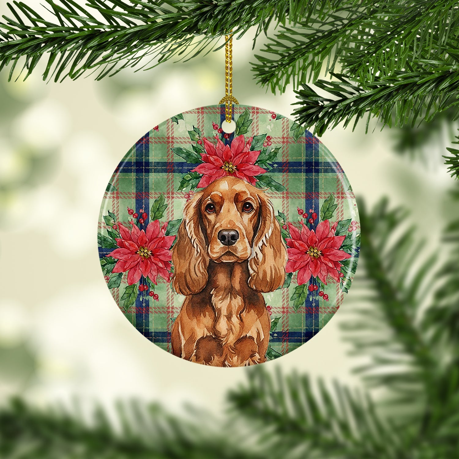 Ceramic Ornament featuring breed specific English Cocker Spaniel artwork. Celebrate Christmas with this Christmas Ornament. Add a touch of personalized charm to your Christmas tree this holiday season with our Ceramic Ornament. Measuring 2.8125 inches in diameter, this round porcelain ornament beautifully reflects your festive lights, enhancing your holiday decor. The gloss surface sets off the vibrant, full-color artwork contributed by one of our talented artists, bringing a pop of color and joy to your tree. This Ceramic Ornament doesn't stop at being merely decorative. The white back is designed for personalization. Write a heartfelt message, mark a special year, or inscribe a date with a paint pen or a permanent marker to create a treasured memento. Please ensure you allow any personalization to dry thoroughly before handling to maintain the pristine finish. Included with the ornament is a delicate gold cord for easy hanging. Made in the USA, this Ceramic Ornament makes an exceptional gift for a pet sitter, teacher, family member, or anyone you wish to share a little Christmas magic with. With its blend of style, charm, and personal touch, it's a meaningful addition to any Christmas tree.