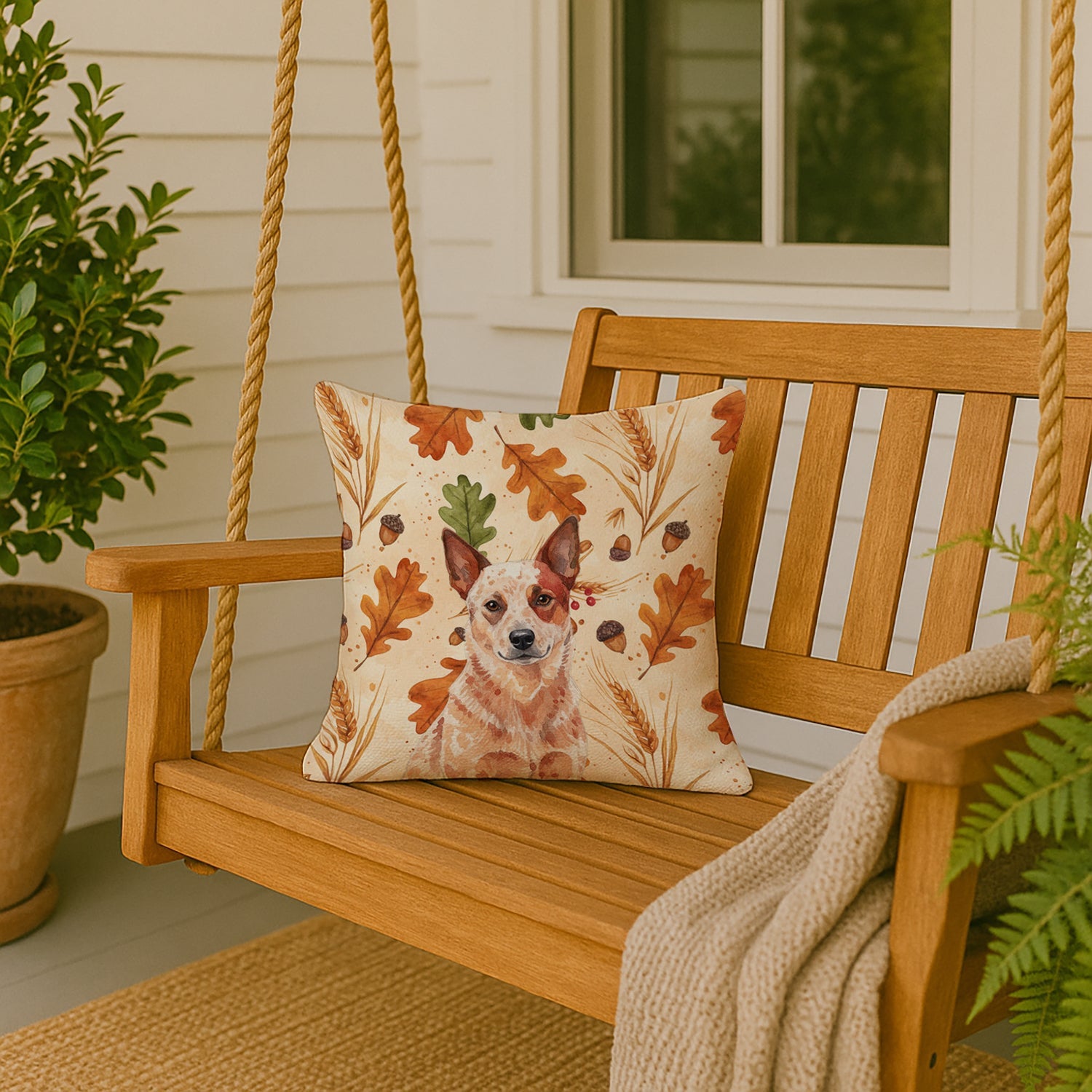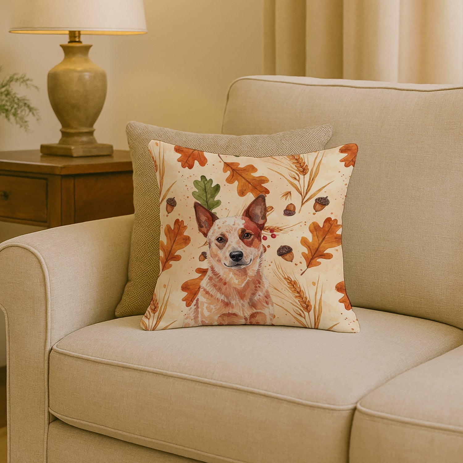 Throw Pillow featuring breed specific Australian Cattle Dog artwork. Celebrate Thanksgiving with this Thanksgiving Pillow. Revitalize your outdoor or indoor living space with Caroline's Treasures 18x18 Fabric Decorative Pillow. With a generously sized dimension of approximately 18 inches by 18 inches, this pillow makes a comfortable and aesthetic addition to any seating area. Made from a unique, water-resistant material developed by Caroline's Treasures, the pillow sham is 100% polyester fabric that's durable and ready to weather any condition. Its vibrant, full-color artwork will not fade over time as it is dyed with color-fast dyes. Whether you place it on your patio furniture, porch, veranda, or indoor couch, its soft canvas fabric ensures a cozy experience. The pillow is handcrafted in the United States, featuring a sham created from three pieces of fabric and a polyester insert for enduring shape and overstuffed comfort. Despite being robustly built to endure the outdoors, it is as soft and snug as your favorite indoor cushions. Please note, as all our pillows are handmade, sizes may vary slightly, adding to the charm of this unique decorative item.