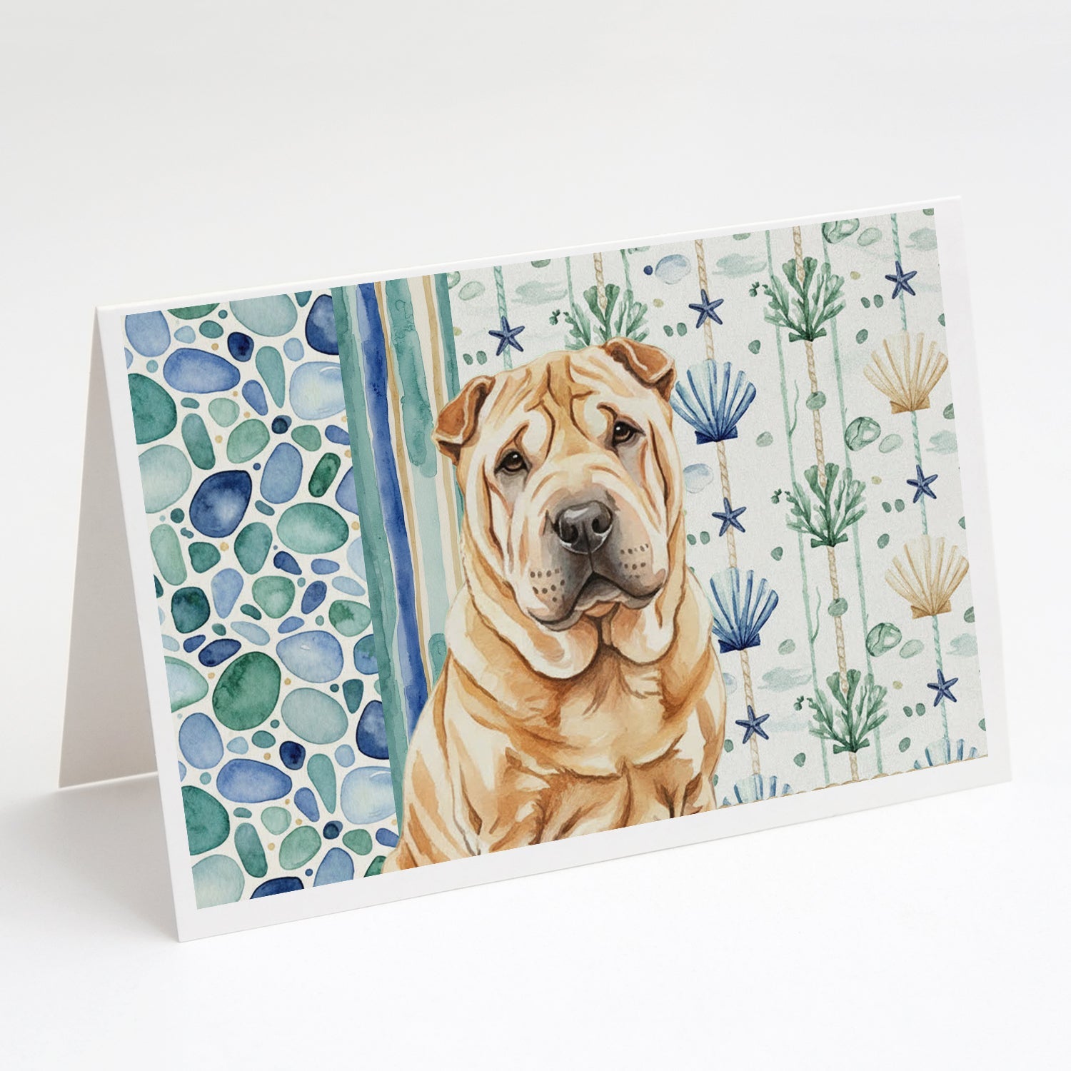 Shown here is the Red Shar Pei Coastal Sea Glass Greeting Cards Pack of 8 from Caroline's Treasures featuring artwork of a Shar Pei in a Everyday design. The detailed illustration and vibrant colors make it a standout accent that celebrates both seasonal style and love for the subject. This image features a calming coastal watercolor pattern with soft seashells, seaweed, starfish, and pebble-inspired accents arranged in a repeating design. The soothing palette of blues, greens, and sandy neutrals creates a relaxed, beach-inspired look that adds a fresh and tranquil feel to any space. Everyday décor celebrates personal style and the small moments that make a house feel like home. Thoughtful designs add warmth and personality that can be enjoyed year-round. Celebrate special moments with Caroline's Treasures Printed Greeting Card Pack. This pack includes eight beautifully folded 5x7 cards, accompanied by eight matching white envelopes. With blank interiors, these cards provide ample space for your personalized messages and heartfelt holiday greetings. Each card features captivating full-color artwork, meticulously printed in our facility on high-quality 80 lb cover stock or 216 GSM. The super smooth finish of the white cards enhances the visual impact of the artwork, creating a truly stunning presentation. Designed by our talented in-house artists or licensed artists, the artwork on these cards showcases their creativity and attention to detail. From vibrant illustrations to captivating designs, each card tells its own unique story. Whether it's for birthdays, anniversaries, holidays, or any special occasion, Caroline's Treasures Greeting Card Pack is the perfect way to convey your heartfelt sentiments. Share joy, love, and warm wishes with these exquisite cards and make every moment unforgettable. Perfect for: Writing personal messages, everyday correspondence, and thoughtful notes, Dogs-themed stationery collections, or year-round use for Shar Pei lovers. Shar Peis are distinctive dogs known for their wrinkled skin and reserved temperament. This ancient breed is respected for its loyalty, independence, and calm demeanor. Makes a heartfelt gift for: Shar Pei owners, Dogs lovers, Everyday gifts, pet parents, friends who adore their Shar Pei, or anyone celebrating Dogs.
