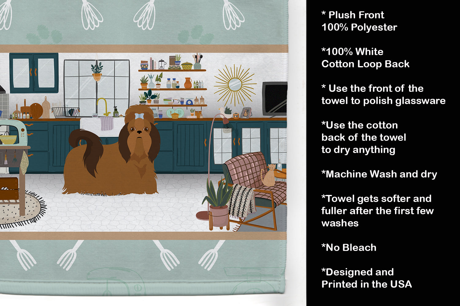 Decorate your space with our Shih Tzu artwork on a Kitchen Towel. Experience the perfect blend of aesthetic appeal and functional excellence with our Plush Velour Kitchen Towels. These are not your ordinary decorative kitchen towels that gather dust. Instead, they are designed to be as practical as they are stylish. The front layer of our towel is constructed from a minky plush polyester, known for its durability and color retention. Unlike conventional kitchen towels, the artwork on our towels is dyed directly into the fabric, ensuring vibrant colors that last. Polish your glassware to a brilliant sparkle using the plush front side of the towel. Flip to the back, crafted from 100% cotton terry loop, to exploit its exceptional absorbency for drying dishes or wiping down counters. Our kitchen towels redefine the concept of functional art, offering lasting quality that maintains the towel's shape over time. Measuring 15 inches by 25 inches and weighing 2.3 lbs per dozen, these towels deliver an overwhelming sensory experience with their soft, plush, and smooth texture. The edges are meticulously finished with binding, enhancing their durability and visual appeal. For your convenience, these towels are machine washable and can be dried on low heat. After the first wash, the top fabric becomes even softer and fluffier, eliminating the need for ironing. Treat your kitchen to the luxury and functionality it deserves with our plush velour kitchen towels.