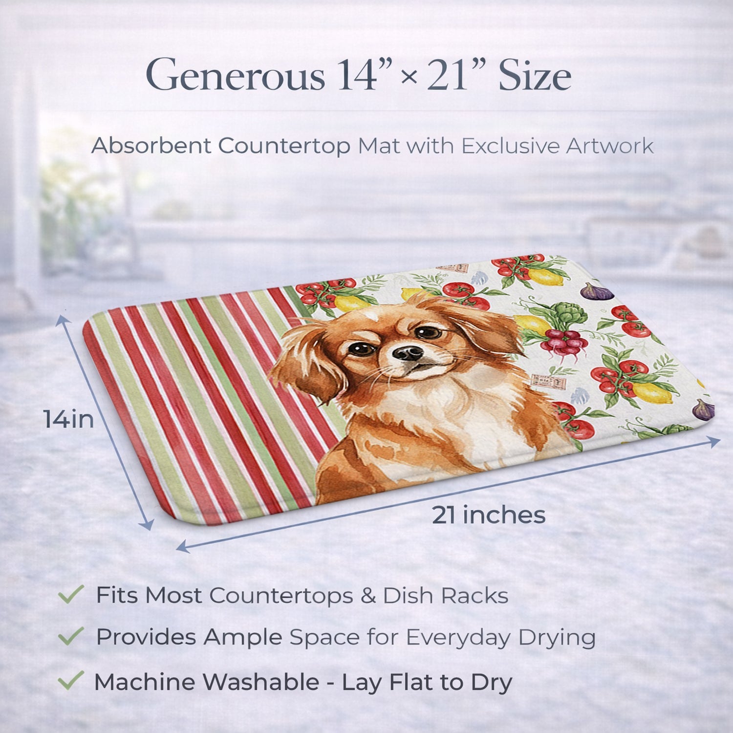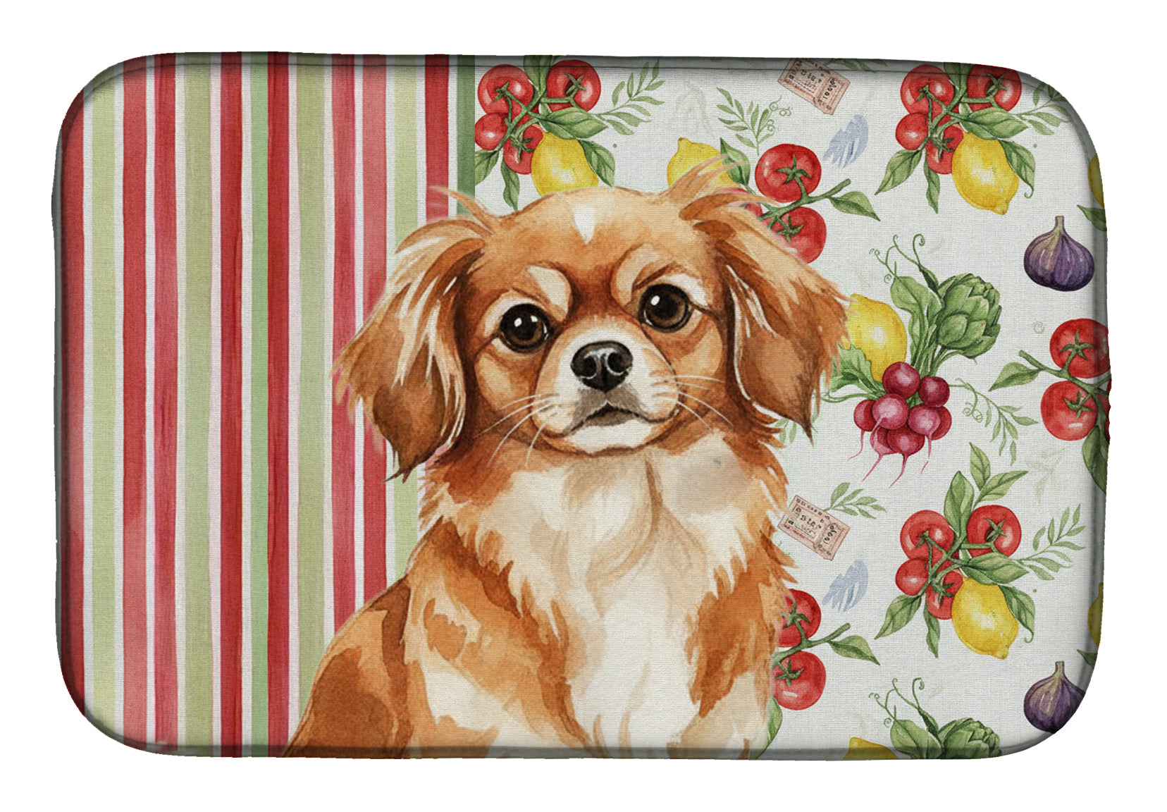 Shown here is the Red Tibetan Spaniel Vegetables Dish Drying Mat from Caroline's Treasures featuring artwork of a Tibetan Spaniel in a Everyday design. The detailed illustration and vibrant colors make it a standout accent that celebrates both seasonal style and love for the subject. This image features a vibrant watercolor vegetable pattern with tomatoes, lemons, artichokes, figs, radishes, and leafy greens arranged in a repeating design, paired with classic red and green stripes. The bright, garden-fresh palette creates a cheerful, farmhouse-inspired look that feels lively, welcoming, and perfect for kitchen décor. Everyday décor celebrates personal style and the small moments that make a house feel like home. Thoughtful designs add warmth and personality that can be enjoyed year-round. Say goodbye to messy countertops and soggy dish towels with our innovative dish drying mat. Our high-quality dish drying pad is designed to keep your countertops dry while offering a stylish and efficient solution. Whether you're air drying dishes, glasses, stemware, silverware, pots, pans, bottles, or even fruits and vegetables, our dish mat is the perfect choice. The 14 inches x 21 inches size fits most counters and dish drying racks, and the non-slip design ensures stability. Made with water-absorbent polyester and a polyurethane foam insert, our dish drying mat is not only functional but also durable. It's machine washable and printed in the USA for long-lasting use. The beautiful artwork adds flair to your kitchen decor, making it a perfect housewarming gift or present for any occasion. Upgrade your kitchen experience with our absorbent and versatile dish drying mat. Perfect for: Kitchen counters and sinks, everyday dish drying and countertop protection, Dogs-themed homes, or year-round use for Tibetan Spaniel lovers. Tibetan Spaniels are small companion dogs known for their intelligence and alert nature. This breed is cherished for its loyalty, independence, and affectionate personality. Makes a heartfelt gift for: Tibetan Spaniel owners, Dogs lovers, Everyday gifts, pet parents, friends who adore their Tibetan Spaniel, or anyone celebrating Dogs.
