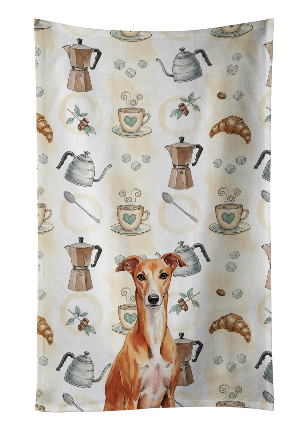 Kitchen Towel featuring breed specific Whippet artwork. Start your morning with charm and function thanks to our Coffee Time Kitchen Towel Collection. Featuring playful watercolor artwork of coffee pots, cups, croissants, and a dog portrait, these towels bring warmth and personality to your kitchen or bath. Crafted with a plush minky polyester front that polishes glassware to a shine, and a 100% cotton terry loop back for absorbency, they combine durability with practicality. Artwork is permanently dyed into the fibers to keep colors fresh wash after wash. Measuring 15" x 25", these machine-washable towels are finished with bound edges to hold their shape. Designed and printed in the USA, they’re perfect for kitchens, coffee bars, guest baths, or as thoughtful gifts for dog lovers and coffee enthusiasts alike.
