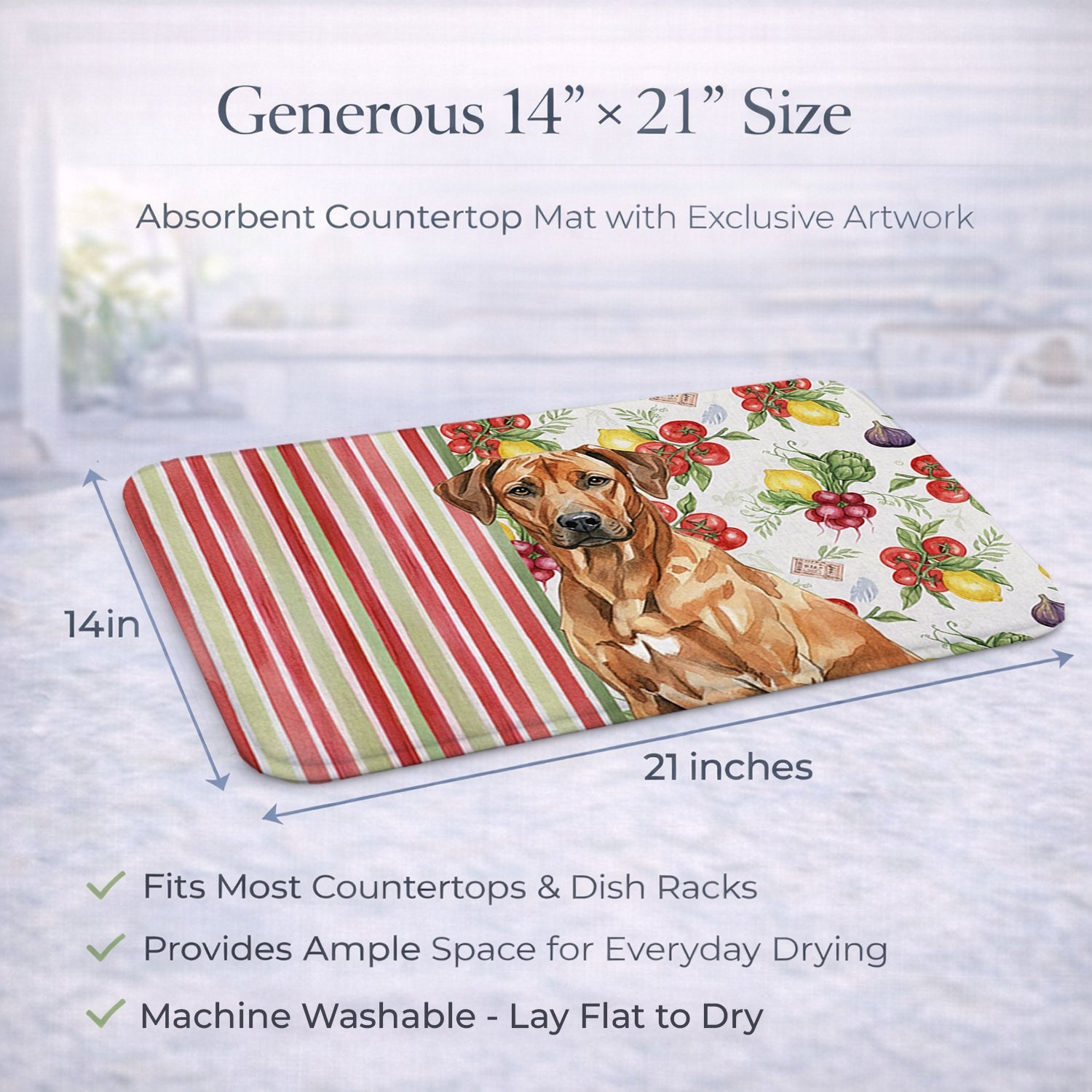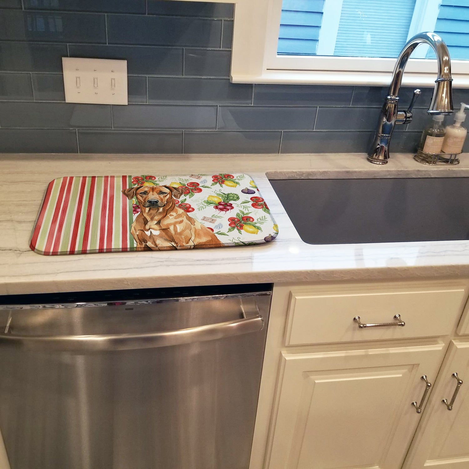 Shown here is the Rhodesian Ridgeback Vegetables Dish Drying Mat from Caroline's Treasures featuring artwork of a Rhodesian Ridgeback in a Everyday design. The detailed illustration and vibrant colors make it a standout accent that celebrates both seasonal style and love for the subject. This image features a vibrant watercolor vegetable pattern with tomatoes, lemons, artichokes, figs, radishes, and leafy greens arranged in a repeating design, paired with classic red and green stripes. The bright, garden-fresh palette creates a cheerful, farmhouse-inspired look that feels lively, welcoming, and perfect for kitchen décor. Everyday décor celebrates personal style and the small moments that make a house feel like home. Thoughtful designs add warmth and personality that can be enjoyed year-round. Say goodbye to messy countertops and soggy dish towels with our innovative dish drying mat. Our high-quality dish drying pad is designed to keep your countertops dry while offering a stylish and efficient solution. Whether you're air drying dishes, glasses, stemware, silverware, pots, pans, bottles, or even fruits and vegetables, our dish mat is the perfect choice. The 14 inches x 21 inches size fits most counters and dish drying racks, and the non-slip design ensures stability. Made with water-absorbent polyester and a polyurethane foam insert, our dish drying mat is not only functional but also durable. It's machine washable and printed in the USA for long-lasting use. The beautiful artwork adds flair to your kitchen decor, making it a perfect housewarming gift or present for any occasion. Upgrade your kitchen experience with our absorbent and versatile dish drying mat. Perfect for: Kitchen counters and sinks, everyday dish drying and countertop protection, Dogs-themed homes, or year-round use for Rhodesian Ridgeback lovers. Rhodesian Ridgebacks are strong, athletic dogs known for their independence and distinctive ridge of hair. This breed is admired for its loyalty, confidence, and calm presence. Makes a heartfelt gift for: Rhodesian Ridgeback owners, Dogs lovers, Everyday gifts, pet parents, friends who adore their Rhodesian Ridgeback, or anyone celebrating Dogs.