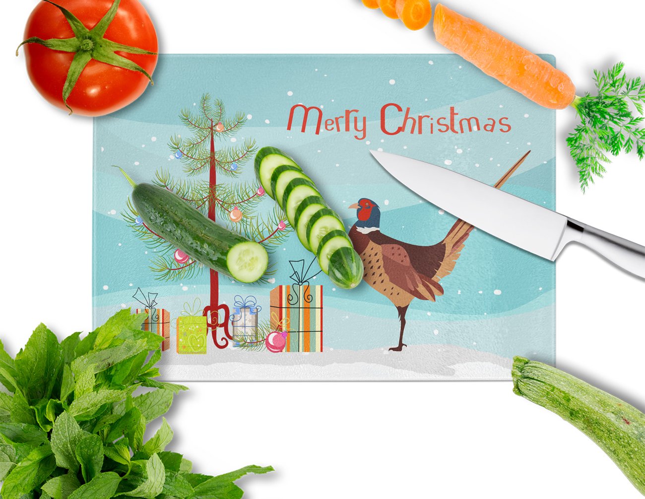 Decorate your space with our Christmas Ring-necked Common Pheasant artwork on a Cutting Board. Introduce your kitchen to the vibrant, large Decorative Glass Cutting Board from Caroline's Treasures. Crafted from resilient tempered glass, this board is not only a utilitarian necessity but also a colorful art piece. With its generous dimensions of 15 inches in height and 12 inches in length, it offers ample space for all your cutting needs. Every piece showcases captivating artwork from distinguished artists, bringing an aesthetic edge to your kitchen. Beyond its attractive design, this cutting board ensures your countertop stays pristine and unscathed, owing to its heat-resistant properties. Engineered with user convenience in mind, it features non-skid feet for stability, and rounded corners for additional safety. Its robust construction renders it virtually unbreakable, guaranteeing longevity. The board comes with protective feet bumpers, maintaining its position during use. This product is recommended to be hand washed only. Proudly printed and assembled in the United States, this cutting board exemplifies superior craftsmanship. With Caroline's Treasures' Decorative Glass Cutting Board, you're investing in a blend of functionality and artistic flair.