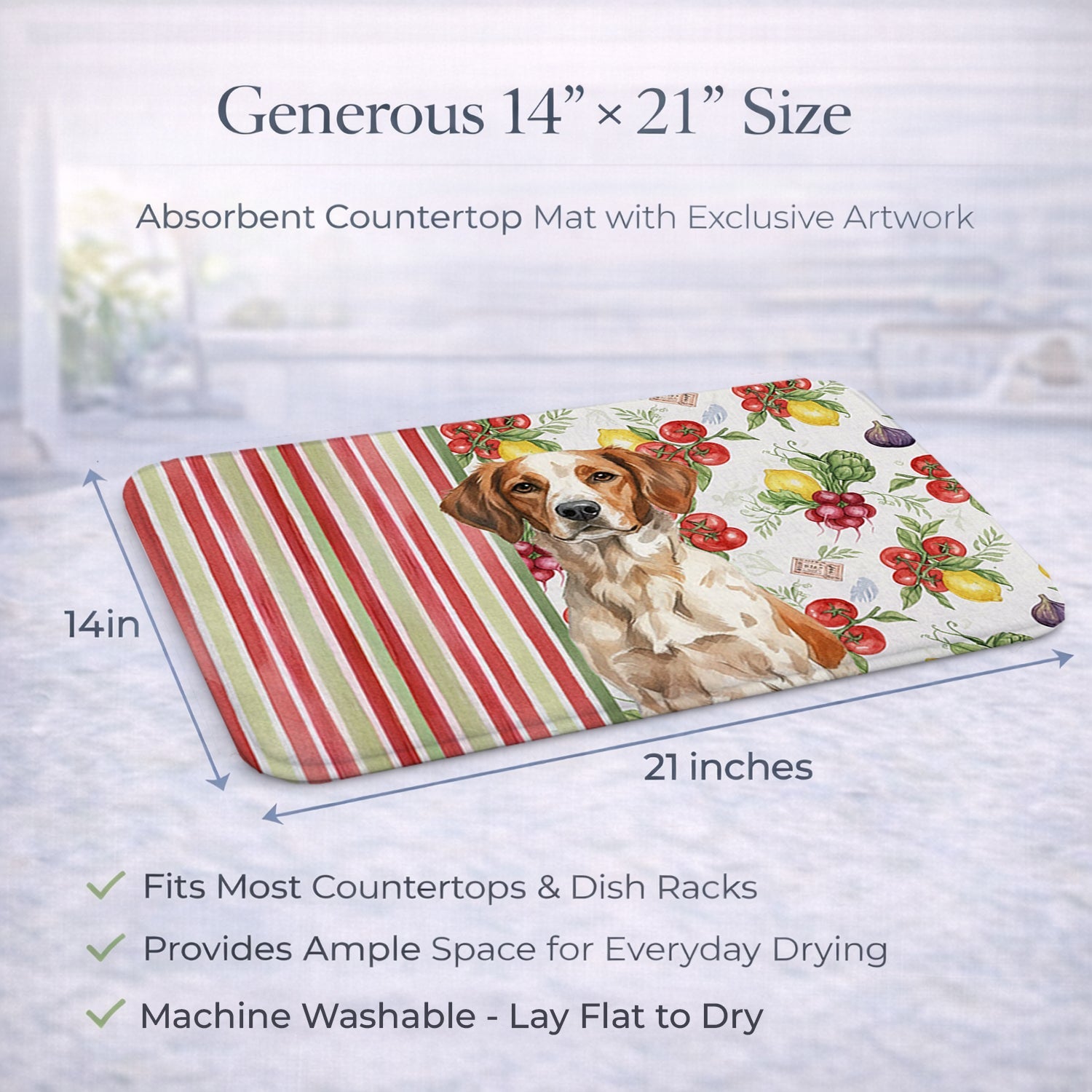 Shown here is the Roan Brittany Vegetables Dish Drying Mat from Caroline's Treasures featuring artwork of a Brittany in a Everyday design. The detailed illustration and vibrant colors make it a standout accent that celebrates both seasonal style and love for the subject. This image features a vibrant watercolor vegetable pattern with tomatoes, lemons, artichokes, figs, radishes, and leafy greens arranged in a repeating design, paired with classic red and green stripes. The bright, garden-fresh palette creates a cheerful, farmhouse-inspired look that feels lively, welcoming, and perfect for kitchen décor. Everyday décor celebrates personal style and the small moments that make a house feel like home. Thoughtful designs add warmth and personality that can be enjoyed year-round. Say goodbye to messy countertops and soggy dish towels with our innovative dish drying mat. Our high-quality dish drying pad is designed to keep your countertops dry while offering a stylish and efficient solution. Whether you're air drying dishes, glasses, stemware, silverware, pots, pans, bottles, or even fruits and vegetables, our dish mat is the perfect choice. The 14 inches x 21 inches size fits most counters and dish drying racks, and the non-slip design ensures stability. Made with water-absorbent polyester and a polyurethane foam insert, our dish drying mat is not only functional but also durable. It's machine washable and printed in the USA for long-lasting use. The beautiful artwork adds flair to your kitchen decor, making it a perfect housewarming gift or present for any occasion. Upgrade your kitchen experience with our absorbent and versatile dish drying mat. Perfect for: Kitchen counters and sinks, everyday dish drying and countertop protection, Dogs-themed homes, or year-round use for Brittany lovers. Brittanys, also known as Brittany Spaniels, are energetic sporting dogs known for their agility and intelligence. This breed is admired for its friendly disposition and strong hunting instincts. Makes a heartfelt gift for: Brittany owners, Dogs lovers, Everyday gifts, pet parents, friends who adore their Brittany, or anyone celebrating Dogs.