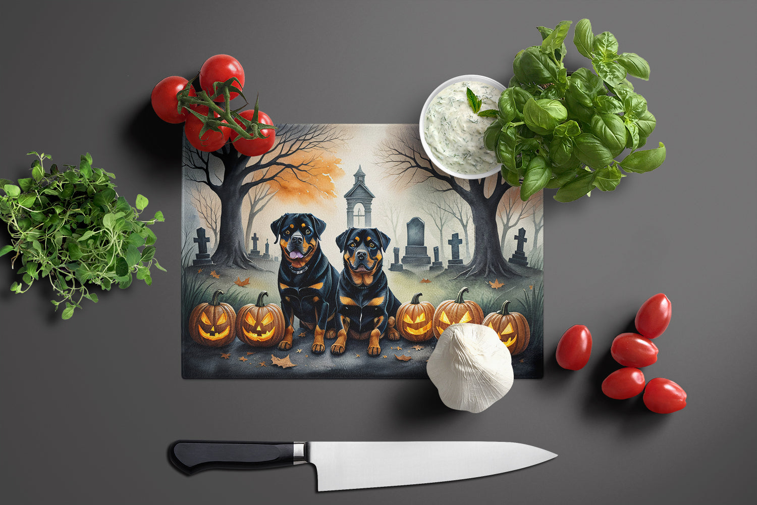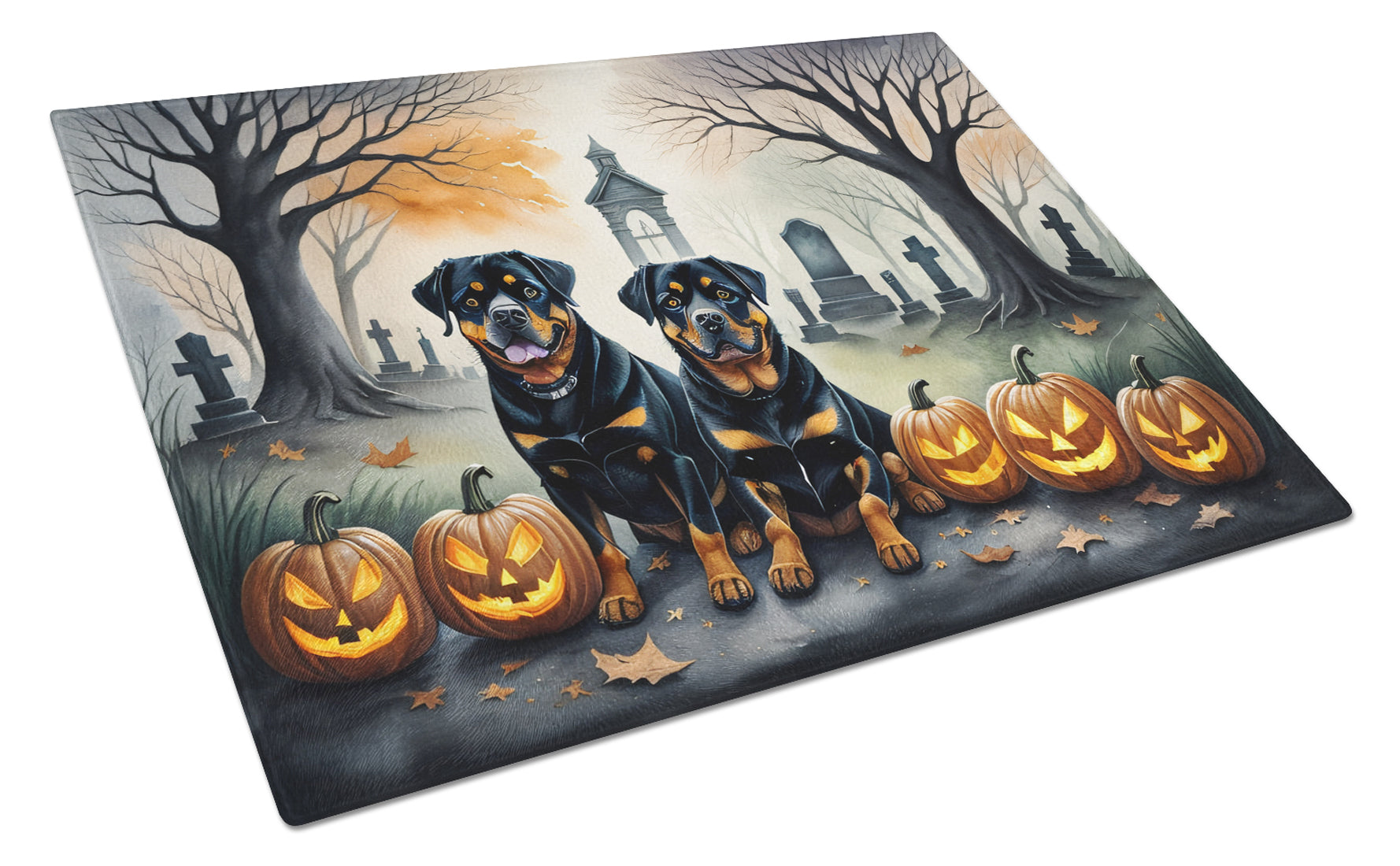 Decorate your space with our Halloween Rottweiler artwork on a Cutting Board. Introduce your kitchen to the vibrant, large Decorative Glass Cutting Board from Caroline's Treasures. Crafted from resilient tempered glass, this board is not only a utilitarian necessity but also a colorful art piece. With its generous dimensions of 15 inches in height and 12 inches in length, it offers ample space for all your cutting needs. Every piece showcases captivating artwork from distinguished artists, bringing an aesthetic edge to your kitchen. Beyond its attractive design, this cutting board ensures your countertop stays pristine and unscathed, owing to its heat-resistant properties. Engineered with user convenience in mind, it features non-skid feet for stability, and rounded corners for additional safety. Its robust construction renders it virtually unbreakable, guaranteeing longevity. The board comes with protective feet bumpers, maintaining its position during use. This product is recommended to be hand washed only. Proudly printed and assembled in the United States, this cutting board exemplifies superior craftsmanship. With Caroline's Treasures' Decorative Glass Cutting Board, you're investing in a blend of functionality and artistic flair.
