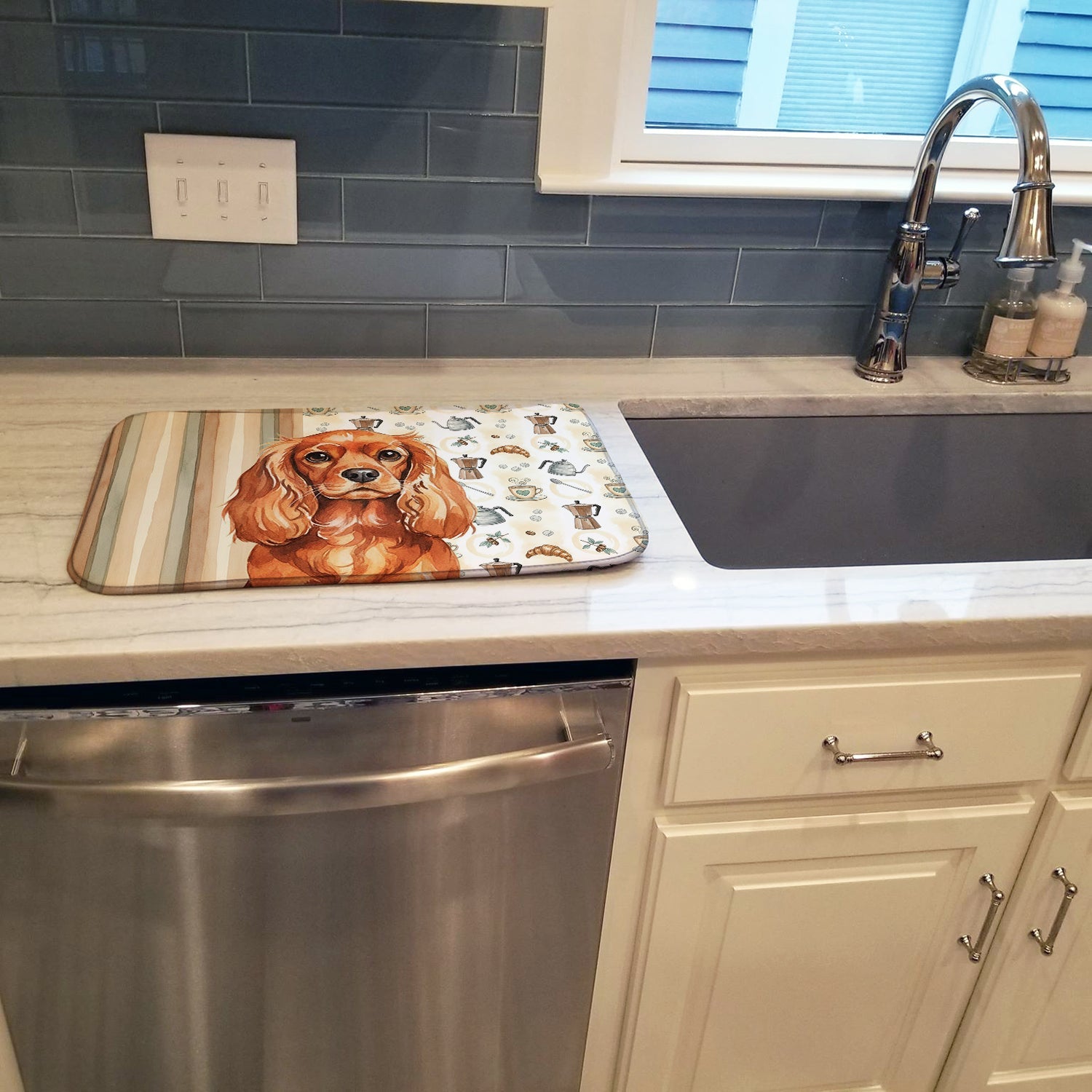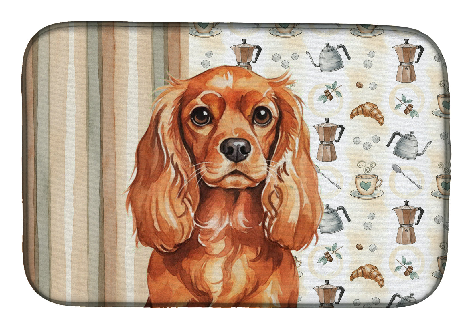 Shown here is the Ruby English Toy Spaniel Coffee Bar Dish Drying Mat from Caroline's Treasures featuring artwork of a English Toy Spaniel in a Everyday design. The detailed illustration and vibrant colors make it a standout accent that celebrates both seasonal style and love for the subject. This image features a cozy watercolor coffee-themed pattern with illustrated mugs, moka pots, kettles, croissants, coffee beans, and sugar cubes arranged in a repeating design. Soft neutral tones with warm browns, creams, and subtle sage accents create an inviting, café-inspired look that feels comforting and relaxed. Everyday décor celebrates personal style and the small moments that make a house feel like home. Thoughtful designs add warmth and personality that can be enjoyed year-round. Say goodbye to messy countertops and soggy dish towels with our innovative dish drying mat. Our high-quality dish drying pad is designed to keep your countertops dry while offering a stylish and efficient solution. Whether you're air drying dishes, glasses, stemware, silverware, pots, pans, bottles, or even fruits and vegetables, our dish mat is the perfect choice. The 14 inches x 21 inches size fits most counters and dish drying racks, and the non-slip design ensures stability. Made with water-absorbent polyester and a polyurethane foam insert, our dish drying mat is not only functional but also durable. It's machine washable and printed in the USA for long-lasting use. The beautiful artwork adds flair to your kitchen decor, making it a perfect housewarming gift or present for any occasion. Upgrade your kitchen experience with our absorbent and versatile dish drying mat. Perfect for: Kitchen counters and sinks, everyday dish drying and countertop protection, Dogs-themed homes, or year-round use for English Toy Spaniel lovers. English Toy Spaniels are affectionate companion dogs known for their gentle nature and expressive eyes. This historic breed is cherished for its calm temperament and devotion to family. Makes a heartfelt gift for: English Toy Spaniel owners, Dogs lovers, Everyday gifts, pet parents, friends who adore their English Toy Spaniel, or anyone celebrating Dogs.