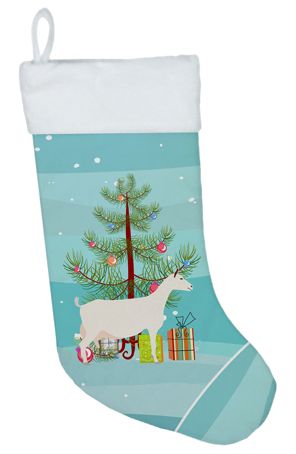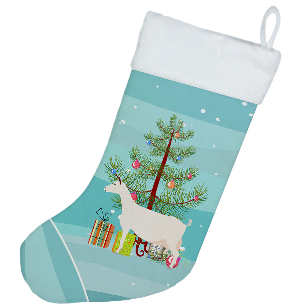 Decorate your space with our Christmas Saanen Goat artwork on a Stocking. Bring the warmth of the festive season into your home with our luxurious Christmas Stocking. Designed to impress, this beautiful stocking is crafted from 100% polyester suede, delivering both superior softness and long-lasting durability. Measuring approximately 18 inches in height and 11 inches in width, it boasts generous space for a delightful assortment of Santa's gifts. What sets our Christmas Stocking apart is the exquisite design that is printed on both sides. Whether you hang it on the mantel or from a stocking hanger, the charming holiday print remains visible, adding a festive spirit to your décor from any direction. The stocking features a robust hanging tab that's crafted from the same suede fabric, guaranteeing secure hanging during the holiday excitement. An added bonus? This Christmas Stocking is completely machine washable. After the season's festivities, simply wash it, lay flat or hang to dry, and it's ready for the next holiday season. Proudly designed, printed and sewn in the United States, our stocking makes a stylish addition to your Christmas décor or a thoughtful gift for loved ones. Cherish the spirit of Christmas with our beautifully crafted, double-sided, easy-care stocking.