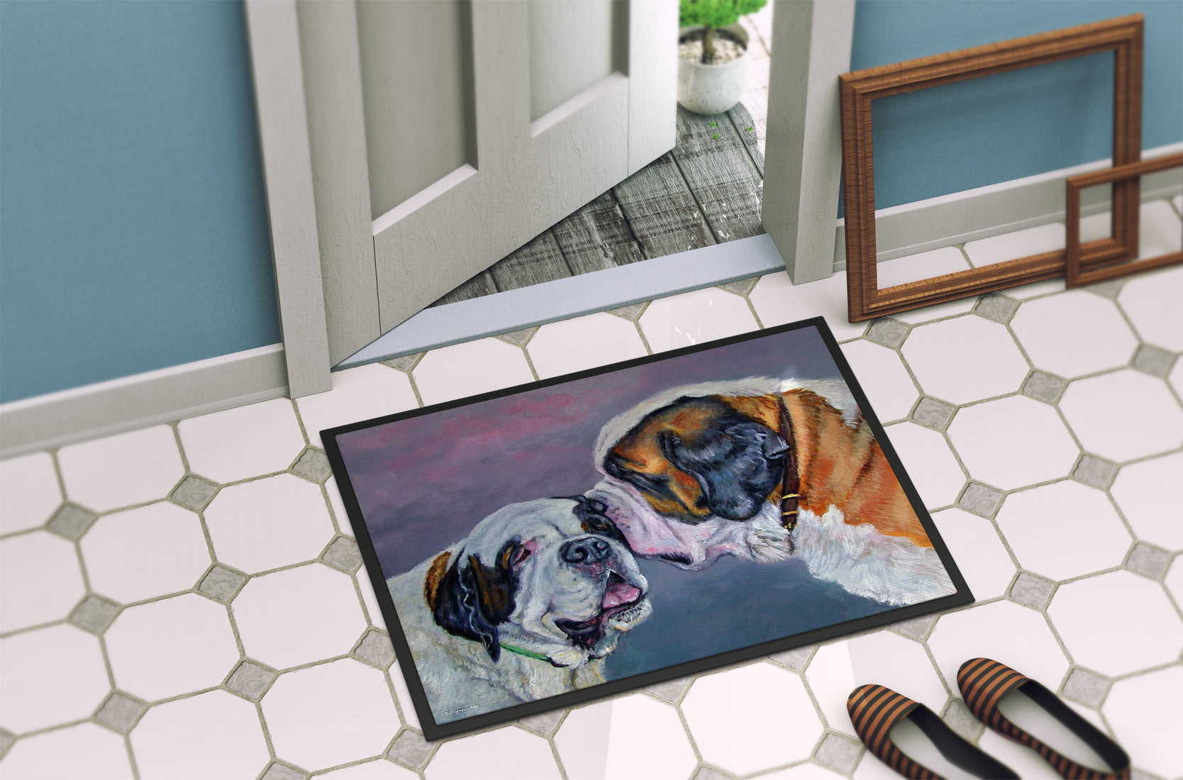 Decorate your space with our Saint Bernard artwork on a Doormat. Welcome your guests in style with our Artwork Door Mat, designed to withstand almost any weather condition. This mat, measuring approximately 18 by 27 inches, is held together by durable black binding tape. Its top layer, composed of polyester felt, is dyed with the eye-catching image you see on the mat. A few layers below provide the mat with stability, while its rubber bottom is stamped to help prevent slipping and ensures safety. Our mat works wonderfully as both an indoor or outdoor door mat. For cleaning, simply hose it off with water or use a power washer - no need for any cleaner that produces suds. Avoid scrubbing with a brush, instead, opt for the vacuum on floor setting. Designed manufactured and printed in the USA, this mat is a perfect addition to your porch, outdoor kitchen, entryway, or any indoor space. Its unique design makes it a charming decorative rug that greets your guests and adds a stylish touch to your home decor.