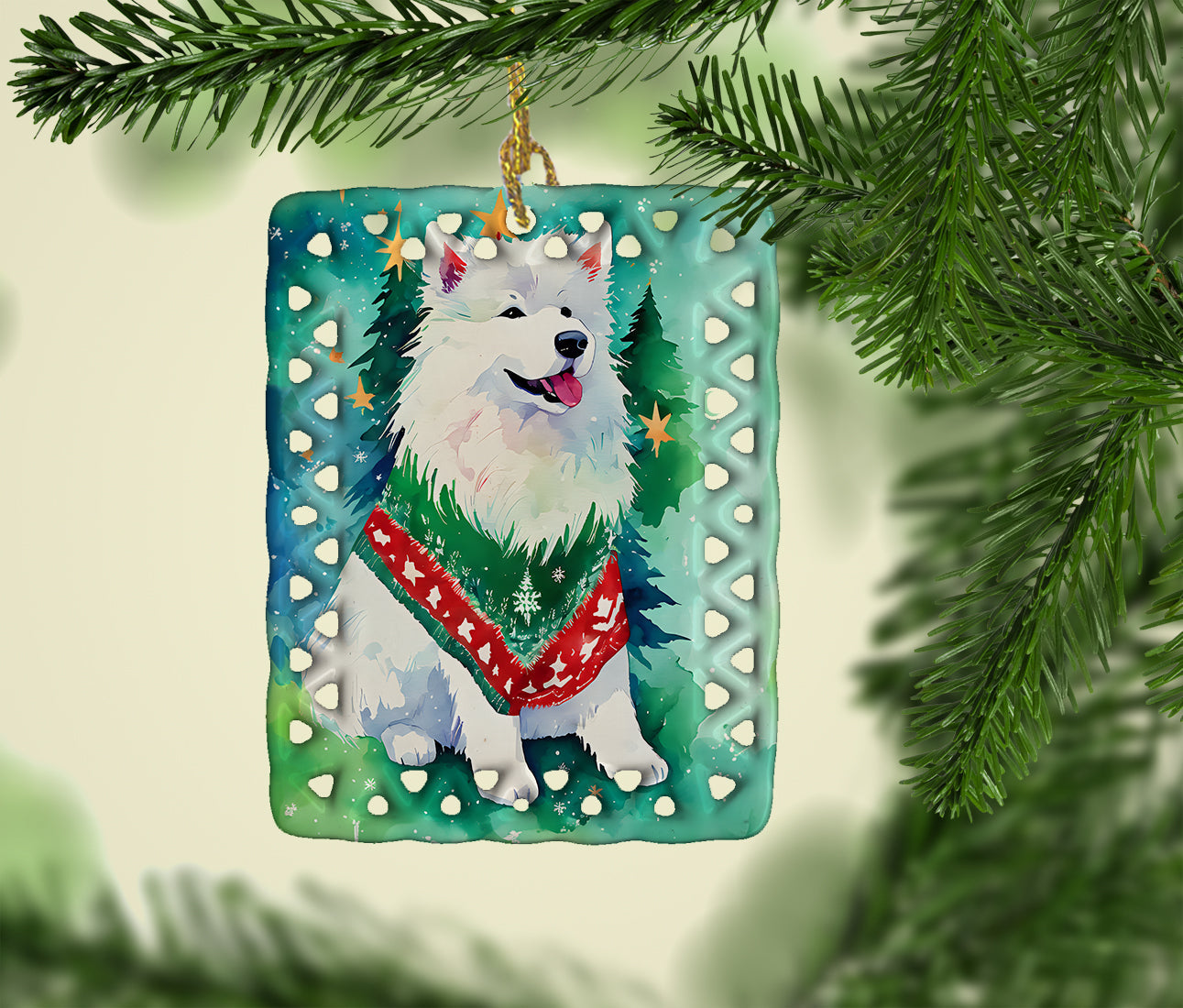 Porcelain Ornament featuring breed specific Samoyed artwork. Celebrate Christmas with this Christmas Ornament. Add a unique, personal touch to your holiday decor with our Rectangular Lattice Porcelain Ornament. Perfect for creating cherished memories, this high-quality ornament shines under festive lights, reflecting warmth and joy throughout your Christmas tree. Crafted with a glossy finish, it showcases vibrant, full-color artwork contributed by our talented artists, ensuring your tree is adorned with a burst of color and holiday spirit. What sets this Porcelain Ornament apart is its customizable white back. Use a paint pen or permanent marker to write a heartfelt message, commemorate a special year, or mark an unforgettable date, turning this ornament into a keepsake that will be treasured for years to come. For best results, allow any personalization to dry thoroughly before handling. Each ornament comes complete with a delicate gold cord, making it easy to hang and display. Proudly made in the USA, this ornament measures 3.375 x 2.625 inches and is a thoughtful gift for pet sitters, teachers, family members, or anyone who would appreciate a little extra holiday magic. Bring style, charm, and a touch of personal meaning to your Christmas tree with this beautifully designed ornament..