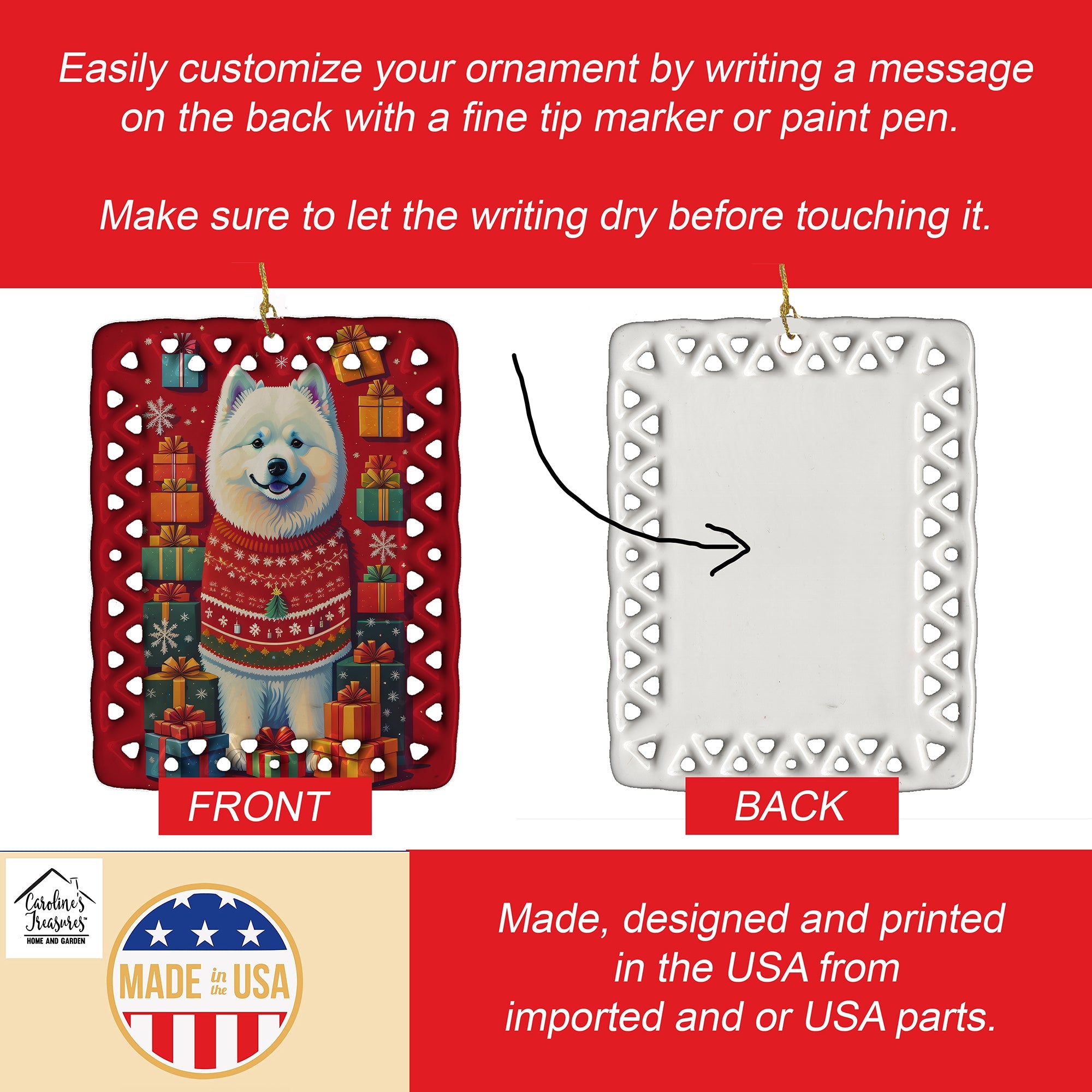 Porcelain Ornament featuring breed specific Samoyed artwork. Celebrate Christmas with this Christmas Ornament. Add a unique, personal touch to your holiday decor with our Rectangular Lattice Porcelain Ornament. Perfect for creating cherished memories, this high-quality ornament shines under festive lights, reflecting warmth and joy throughout your Christmas tree. Crafted with a glossy finish, it showcases vibrant, full-color artwork contributed by our talented artists, ensuring your tree is adorned with a burst of color and holiday spirit. What sets this Porcelain Ornament apart is its customizable white back. Use a paint pen or permanent marker to write a heartfelt message, commemorate a special year, or mark an unforgettable date, turning this ornament into a keepsake that will be treasured for years to come. For best results, allow any personalization to dry thoroughly before handling. Each ornament comes complete with a delicate gold cord, making it easy to hang and display. Proudly made in the USA, this ornament measures 3.375 x 2.625 inches and is a thoughtful gift for pet sitters, teachers, family members, or anyone who would appreciate a little extra holiday magic. Bring style, charm, and a touch of personal meaning to your Christmas tree with this beautifully designed ornament..