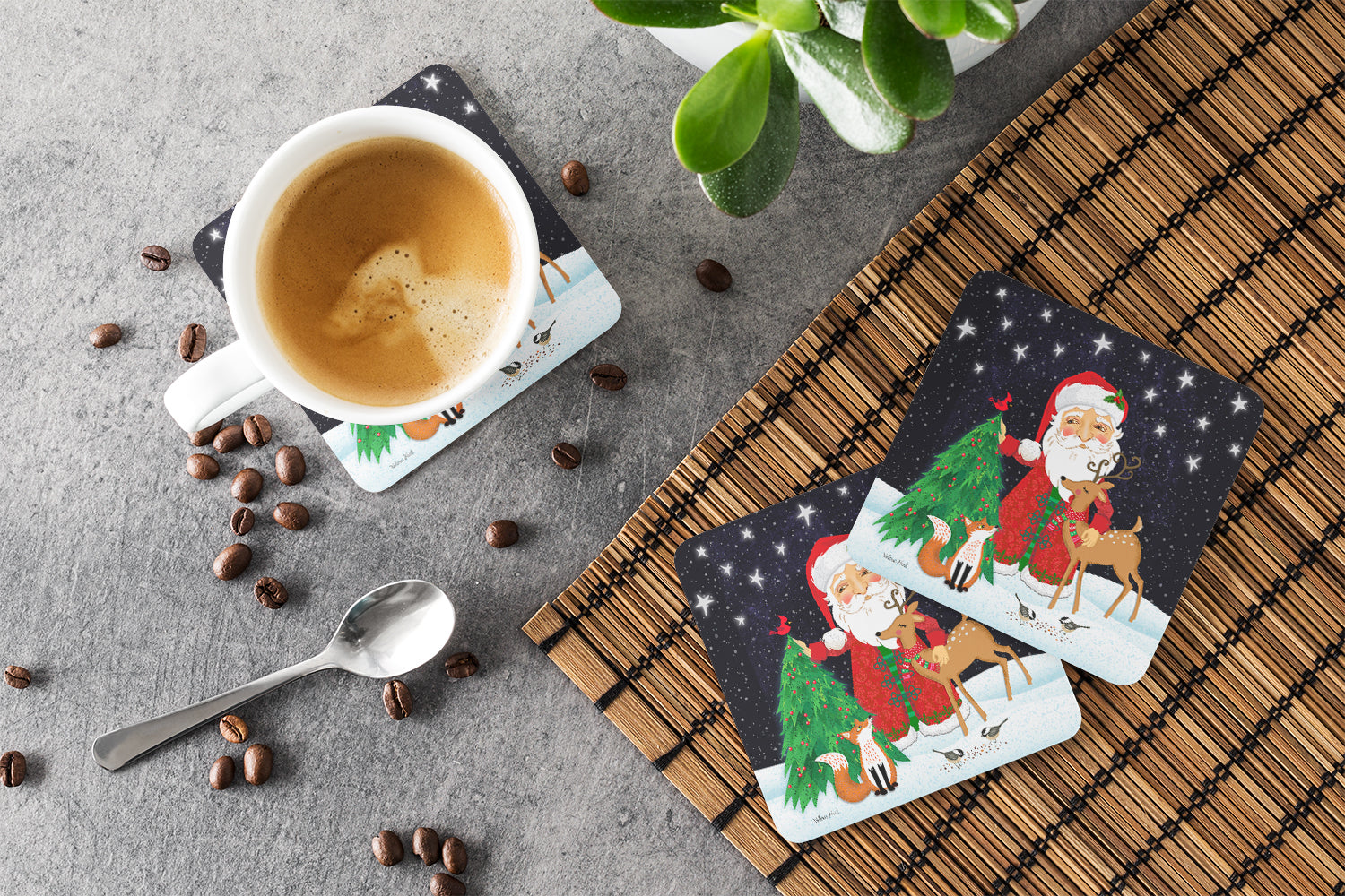 Decorate your space with our Christmas artwork on a Coaster set. Presenting our Set of 4 Foam Coasters, a stylish and practical addition to your table setting. Each square coaster, measuring 3 1/2 inches by 3 1/2 inches, is perfectly sized to accommodate various drinkware, from coffee mugs to tumblers. These coasters stand out with their full-color artwork, permanently dyed onto the material for a vibrant and fade-resistant finish. They're not just functional, they're a fashionable statement, adding a touch of flair to any gathering or event. Our foam coasters serve a dual purpose - they protect your table from water stains and are perfect for both hot and cold drinks. The material used is similar to that of our high-quality mouse pads, ensuring durability and heat resistance. These coasters are easy to maintain - simply wash them in the top of your dishwasher and lay flat to dry. The design won't come off, ensuring they retain their vivid colors for years. Pair them with one of our insulated coolers or huggers for a cohesive, thoughtful gift set. Enhance your beverage experience with our Set of 4 Foam Coasters.
