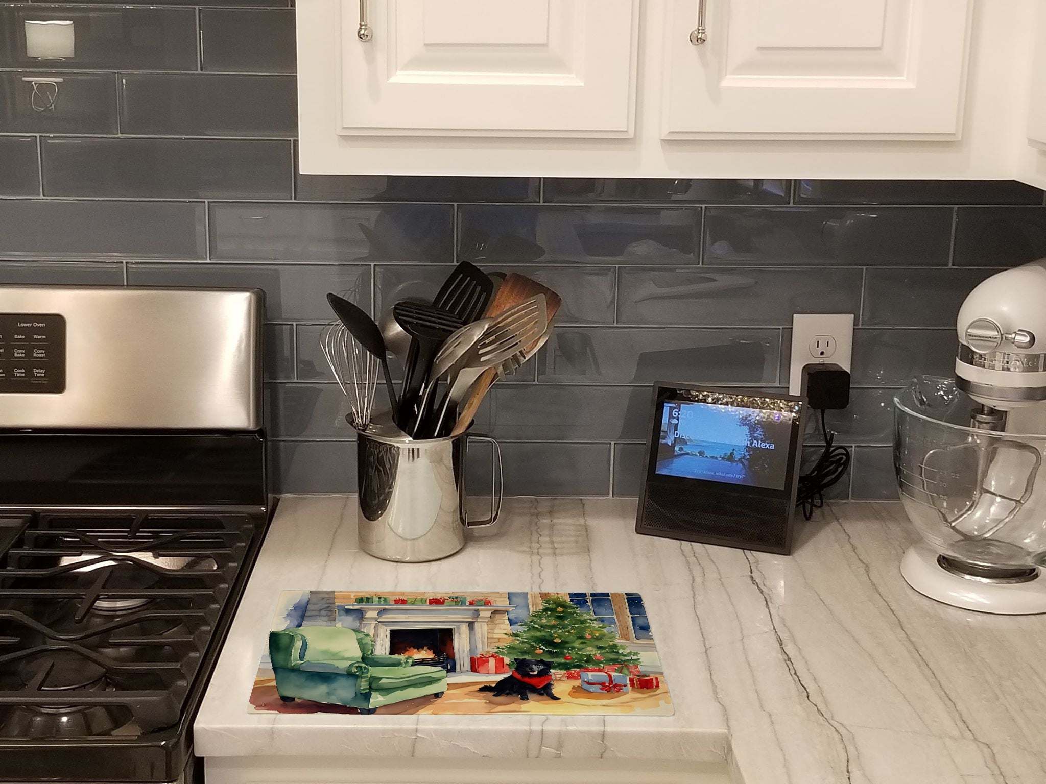 Decorate your space with our Christmas Schipperke artwork on a Cutting Board. Introduce your kitchen to the vibrant, large Decorative Glass Cutting Board from Caroline's Treasures. Crafted from resilient tempered glass, this board is not only a utilitarian necessity but also a colorful art piece. With its generous dimensions of 15 inches in height and 12 inches in length, it offers ample space for all your cutting needs. Every piece showcases captivating artwork from distinguished artists, bringing an aesthetic edge to your kitchen. Beyond its attractive design, this cutting board ensures your countertop stays pristine and unscathed, owing to its heat-resistant properties. Engineered with user convenience in mind, it features non-skid feet for stability, and rounded corners for additional safety. Its robust construction renders it virtually unbreakable, guaranteeing longevity. The board comes with protective feet bumpers, maintaining its position during use. This product is recommended to be hand washed only. Proudly printed and assembled in the United States, this cutting board exemplifies superior craftsmanship. With Caroline's Treasures' Decorative Glass Cutting Board, you're investing in a blend of functionality and artistic flair.