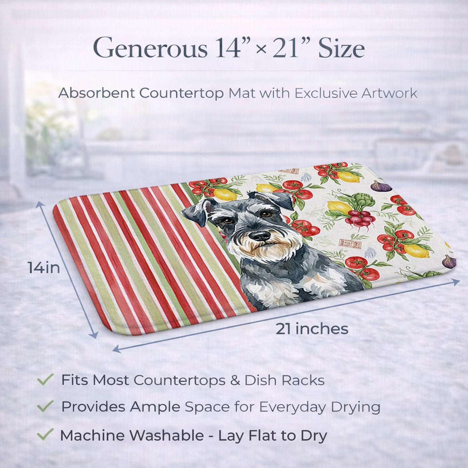 Shown here is the Schnauzer Vegetables Dish Drying Mat from Caroline's Treasures featuring artwork of a Schnauzer in a Everyday design. The detailed illustration and vibrant colors make it a standout accent that celebrates both seasonal style and love for the subject. This image features a vibrant watercolor vegetable pattern with tomatoes, lemons, artichokes, figs, radishes, and leafy greens arranged in a repeating design, paired with classic red and green stripes. The bright, garden-fresh palette creates a cheerful, farmhouse-inspired look that feels lively, welcoming, and perfect for kitchen décor. Everyday décor celebrates personal style and the small moments that make a house feel like home. Thoughtful designs add warmth and personality that can be enjoyed year-round. Say goodbye to messy countertops and soggy dish towels with our innovative dish drying mat. Our high-quality dish drying pad is designed to keep your countertops dry while offering a stylish and efficient solution. Whether you're air drying dishes, glasses, stemware, silverware, pots, pans, bottles, or even fruits and vegetables, our dish mat is the perfect choice. The 14 inches x 21 inches size fits most counters and dish drying racks, and the non-slip design ensures stability. Made with water-absorbent polyester and a polyurethane foam insert, our dish drying mat is not only functional but also durable. It's machine washable and printed in the USA for long-lasting use. The beautiful artwork adds flair to your kitchen decor, making it a perfect housewarming gift or present for any occasion. Upgrade your kitchen experience with our absorbent and versatile dish drying mat. Perfect for: Kitchen counters and sinks, everyday dish drying and countertop protection, Dogs-themed homes, or year-round use for Schnauzer lovers. Schnauzers are intelligent dogs known for their distinctive bearded appearance and alert nature. Available in miniature, standard, and giant sizes, this breed is valued for its loyalty and versatility. Makes a heartfelt gift for: Schnauzer owners, Dogs lovers, Everyday gifts, pet parents, friends who adore their Schnauzer, or anyone celebrating Dogs.