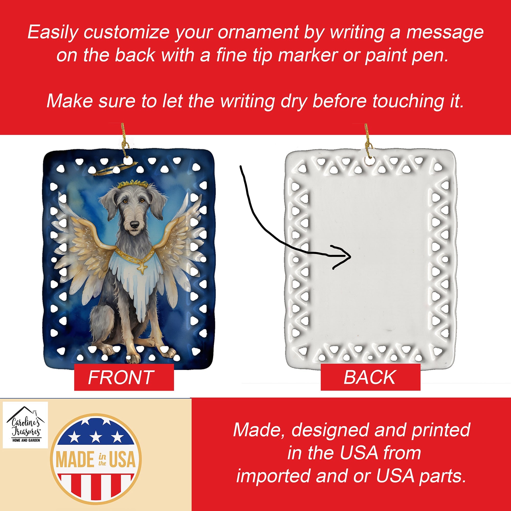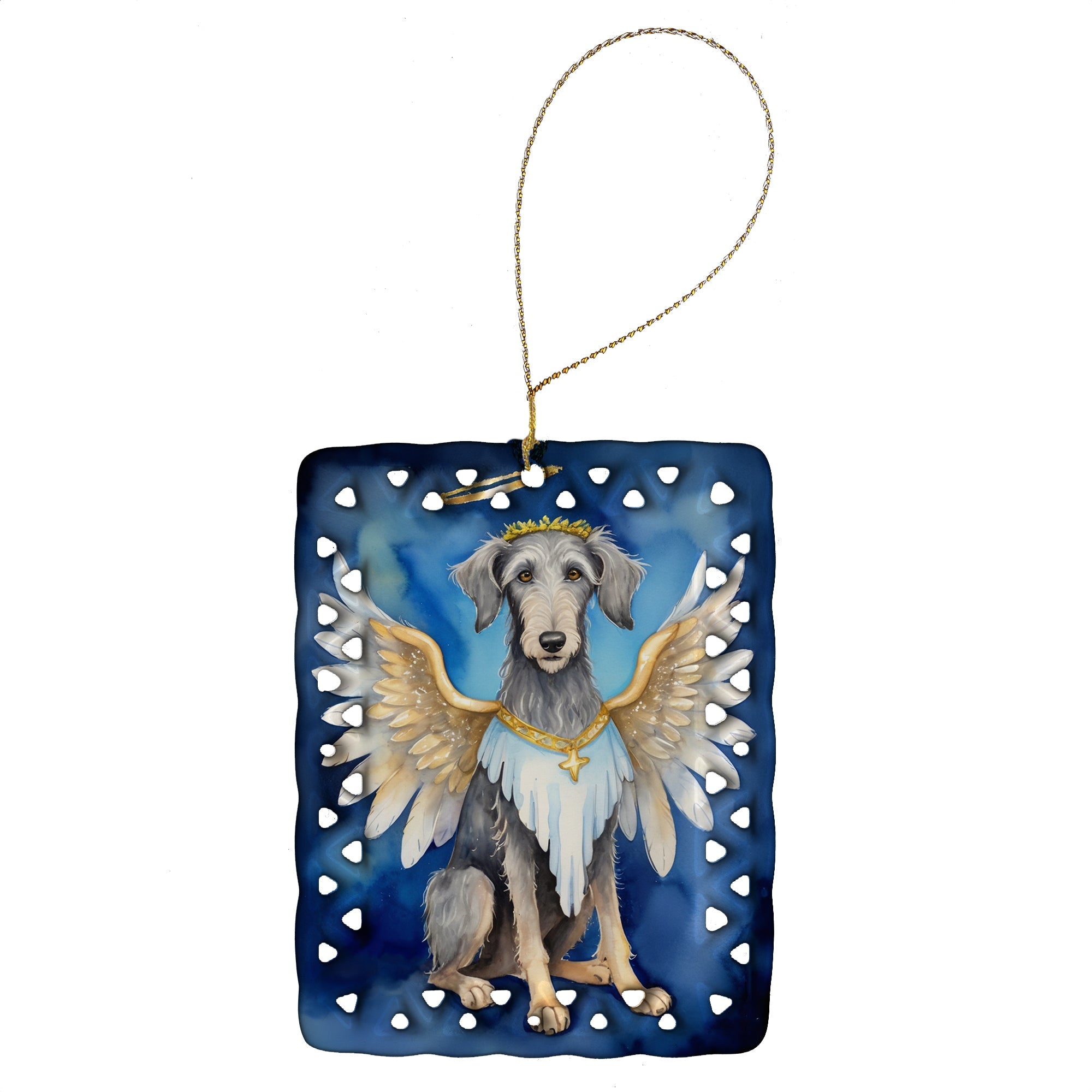 Porcelain Ornament featuring breed specific Scottish Deerhound artwork. Celebrate Christmas with this Christmas Ornament. Add a unique, personal touch to your holiday decor with our Rectangular Lattice Porcelain Ornament. Perfect for creating cherished memories, this high-quality ornament shines under festive lights, reflecting warmth and joy throughout your Christmas tree. Crafted with a glossy finish, it showcases vibrant, full-color artwork contributed by our talented artists, ensuring your tree is adorned with a burst of color and holiday spirit. What sets this Porcelain Ornament apart is its customizable white back. Use a paint pen or permanent marker to write a heartfelt message, commemorate a special year, or mark an unforgettable date, turning this ornament into a keepsake that will be treasured for years to come. For best results, allow any personalization to dry thoroughly before handling. Each ornament comes complete with a delicate gold cord, making it easy to hang and display. Proudly made in the USA, this ornament measures 3.375 x 2.625 inches and is a thoughtful gift for pet sitters, teachers, family members, or anyone who would appreciate a little extra holiday magic. Bring style, charm, and a touch of personal meaning to your Christmas tree with this beautifully designed ornament..