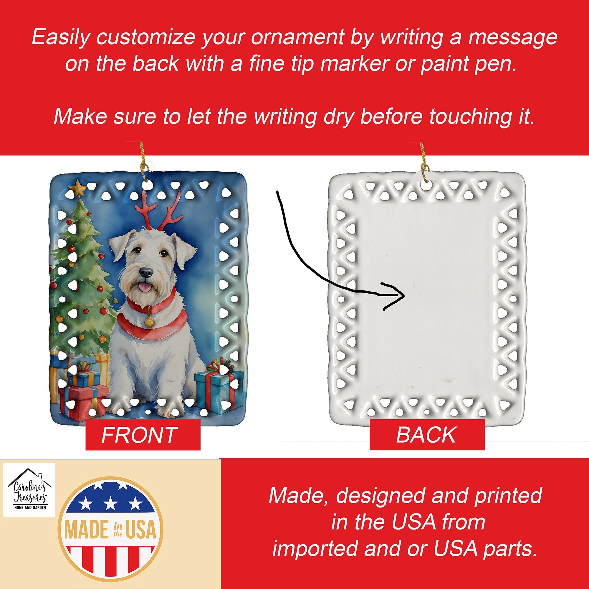 Porcelain Ornament featuring breed specific Sealyham Terrier artwork. Celebrate Christmas with this Christmas Ornament. Add a unique, personal touch to your holiday decor with our Rectangular Lattice Porcelain Ornament. Perfect for creating cherished memories, this high-quality ornament shines under festive lights, reflecting warmth and joy throughout your Christmas tree. Crafted with a glossy finish, it showcases vibrant, full-color artwork contributed by our talented artists, ensuring your tree is adorned with a burst of color and holiday spirit. What sets this Porcelain Ornament apart is its customizable white back. Use a paint pen or permanent marker to write a heartfelt message, commemorate a special year, or mark an unforgettable date, turning this ornament into a keepsake that will be treasured for years to come. For best results, allow any personalization to dry thoroughly before handling. Each ornament comes complete with a delicate gold cord, making it easy to hang and display. Proudly made in the USA, this ornament measures 3.375 x 2.625 inches and is a thoughtful gift for pet sitters, teachers, family members, or anyone who would appreciate a little extra holiday magic. Bring style, charm, and a touch of personal meaning to your Christmas tree with this beautifully designed ornament..