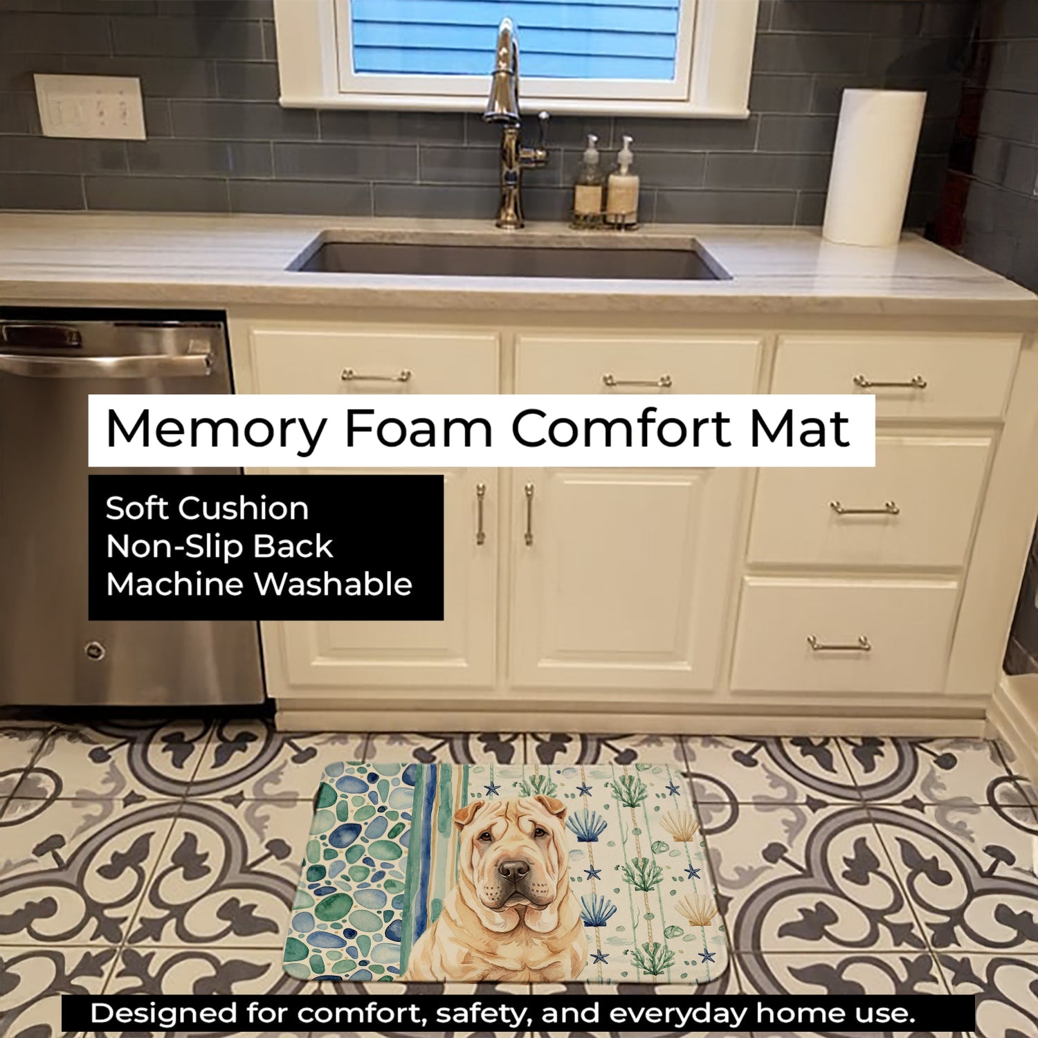 Shown here is the Shar Pei Coastal Sea Glass Memory Foam Kitchen Mat from Caroline's Treasures featuring artwork of a Shar Pei in a Everyday design. The detailed illustration and vibrant colors make it a standout accent that celebrates both seasonal style and love for the subject. This image features a calming coastal watercolor pattern with soft seashells, seaweed, starfish, and pebble-inspired accents arranged in a repeating design. The soothing palette of blues, greens, and sandy neutrals creates a relaxed, beach-inspired look that adds a fresh and tranquil feel to any space. Everyday décor celebrates personal style and the small moments that make a house feel like home. Thoughtful designs add warmth and personality that can be enjoyed year-round. Transform your floor into a work of art with Caroline's Treasures' Memory Foam Mat. This mat offers not only a stunning visual appeal but also a luxurious, plush feel that's incredibly comfortable to the touch. It's a versatile, machine-washable mat designed for both bath and kitchen use, ensuring you experience the best in comfort and convenience. Care Instructions: Maintaining this memory foam mat is a breeze. Simply follow the care instructions on the product tag. It's recommended to wash in cold water and dry on a low-temperature setting in the dryer. This ensures the mat retains its quality and longevity, allowing you to enjoy its beauty and comfort for a long time. Caroline's Treasures' Memory Foam Mat Machine Washable is the perfect blend of artistry, comfort, and practicality, making it a standout addition to any space. Upgrade your home decor with this versatile and stylish mat today. Shar Peis are distinctive dogs known for their wrinkled skin and reserved temperament. This ancient breed is respected for its loyalty, independence, and calm demeanor. Makes a heartfelt gift for: Shar Pei owners, Dogs lovers, Everyday gifts, pet parents, friends who adore their Shar Pei, or anyone celebrating Dogs.