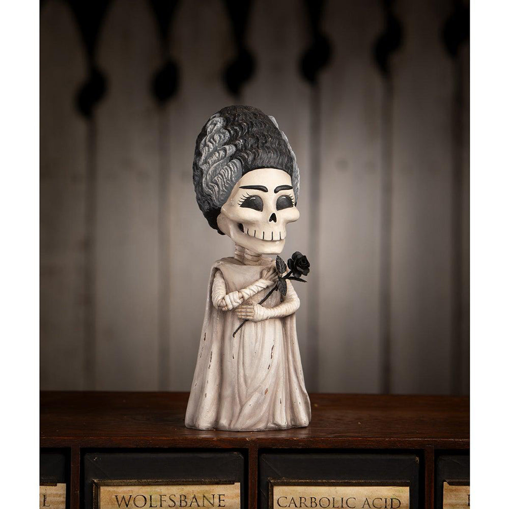 Meet Shelley Skelly, the enchanting bride-of-Frankenstein style skeleton that embodies gothic elegance! With her striking tall black hair featuring grey wavy streaks framing her face, Shelley captures attention with her ethereal beauty. She wears a flowing off-white gown that adds to her haunting charm, while her arms appear partially wrapped, enhancing her mystical allure. In her hand, she delicately holds a black rose. Shelley is the perfect addition to your Halloween decor, combining elegance with a touch of spooky whimsy! This piece is carefully antiqued and distressed by hand to give it a unique, vintage look. Each one is truly one of a kind, with slight variations that add to its charm and character.