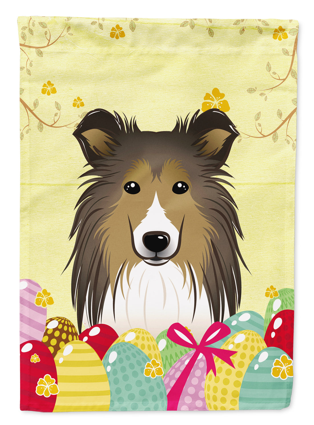 Decorate your space with our Easter Sheltie/Shetland Sheepdog artwork on a Garden Flag. Enhance the beauty of your garden, patio, or yard with Caroline's Treasures Decorative Garden Flag, proudly made in the USA. Crafted from two pieces of thick, double-sided polyester fabric, this 2-ply garden flag is designed to withstand various weather conditions, making it water-resistant and weatherproof. Featuring correctly readable words on both sides, this garden flag offers a delightful visual experience from any angle. With its heavier weight, it stands out among other garden flags, ensuring stability and durability even in wind, rain, and snow. Measuring approximately 11 1/4 inches by 15 1/2 inches, this flag allows you to personalize your outdoor decor. It comes with a 1 1/2-inch sleeve sewn in, allowing easy attachment to any standard garden flag stand or garden size porch hanger (sold separately). Make a statement in your outdoor space with Caroline's Treasures Decorative Garden Flag, a vibrant and high-quality flag that adds color and personality to your surroundings. Proudly made in the USA, it's a symbol of quality craftsmanship and attention to detail.