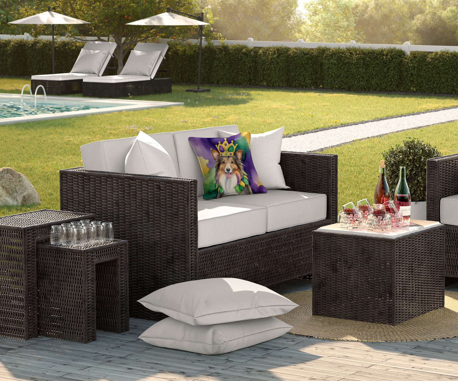 Throw Pillow featuring breed specific Sheltie Shetland Sheepdog artwork. Celebrate Mardi Gras with this Mardi Gras Pillow. Revitalize your outdoor or indoor living space with Caroline's Treasures 18x18 Fabric Decorative Pillow. With a generously sized dimension of approximately 18 inches by 18 inches, this pillow makes a comfortable and aesthetic addition to any seating area. Made from a unique, water-resistant material developed by Caroline's Treasures, the pillow sham is 100% polyester fabric that's durable and ready to weather any condition. Its vibrant, full-color artwork will not fade over time as it is dyed with color-fast dyes. Whether you place it on your patio furniture, porch, veranda, or indoor couch, its soft canvas fabric ensures a cozy experience. The pillow is handcrafted in the United States, featuring a sham created from three pieces of fabric and a polyester insert for enduring shape and overstuffed comfort. Despite being robustly built to endure the outdoors, it is as soft and snug as your favorite indoor cushions. Please note, as all our pillows are handmade, sizes may vary slightly, adding to the charm of this unique decorative item.