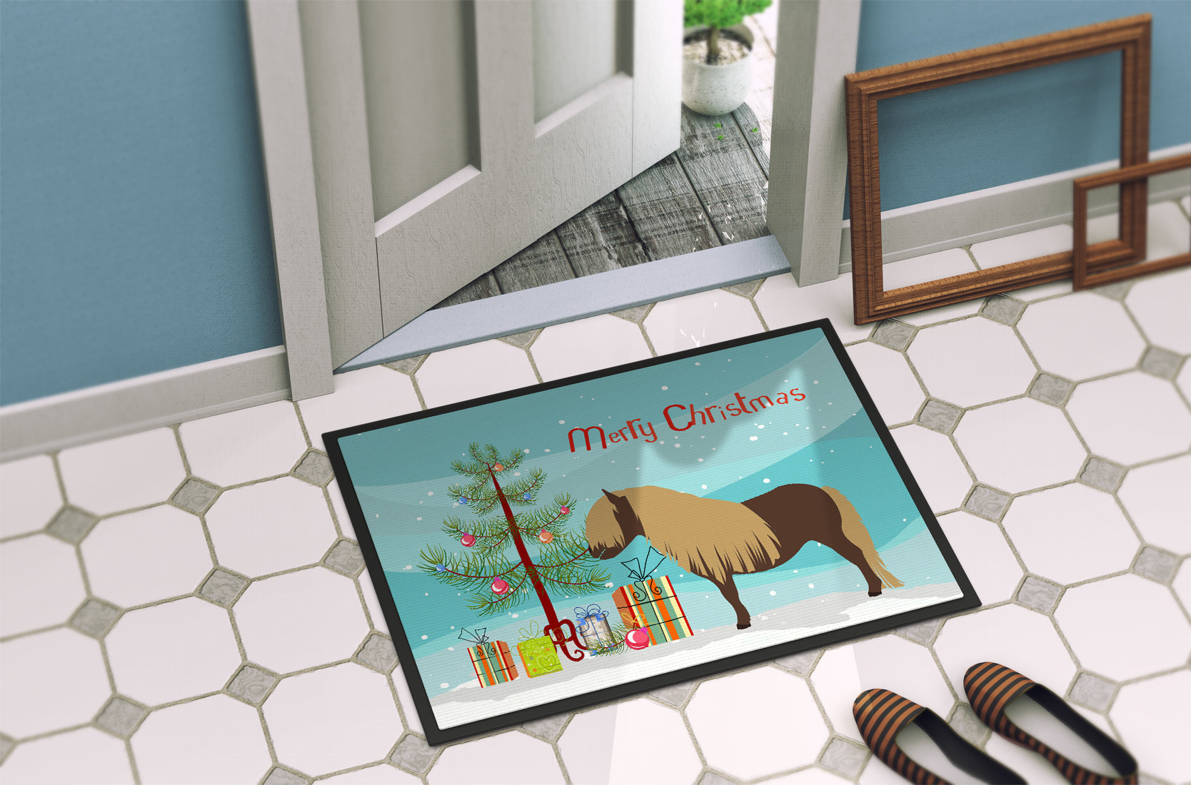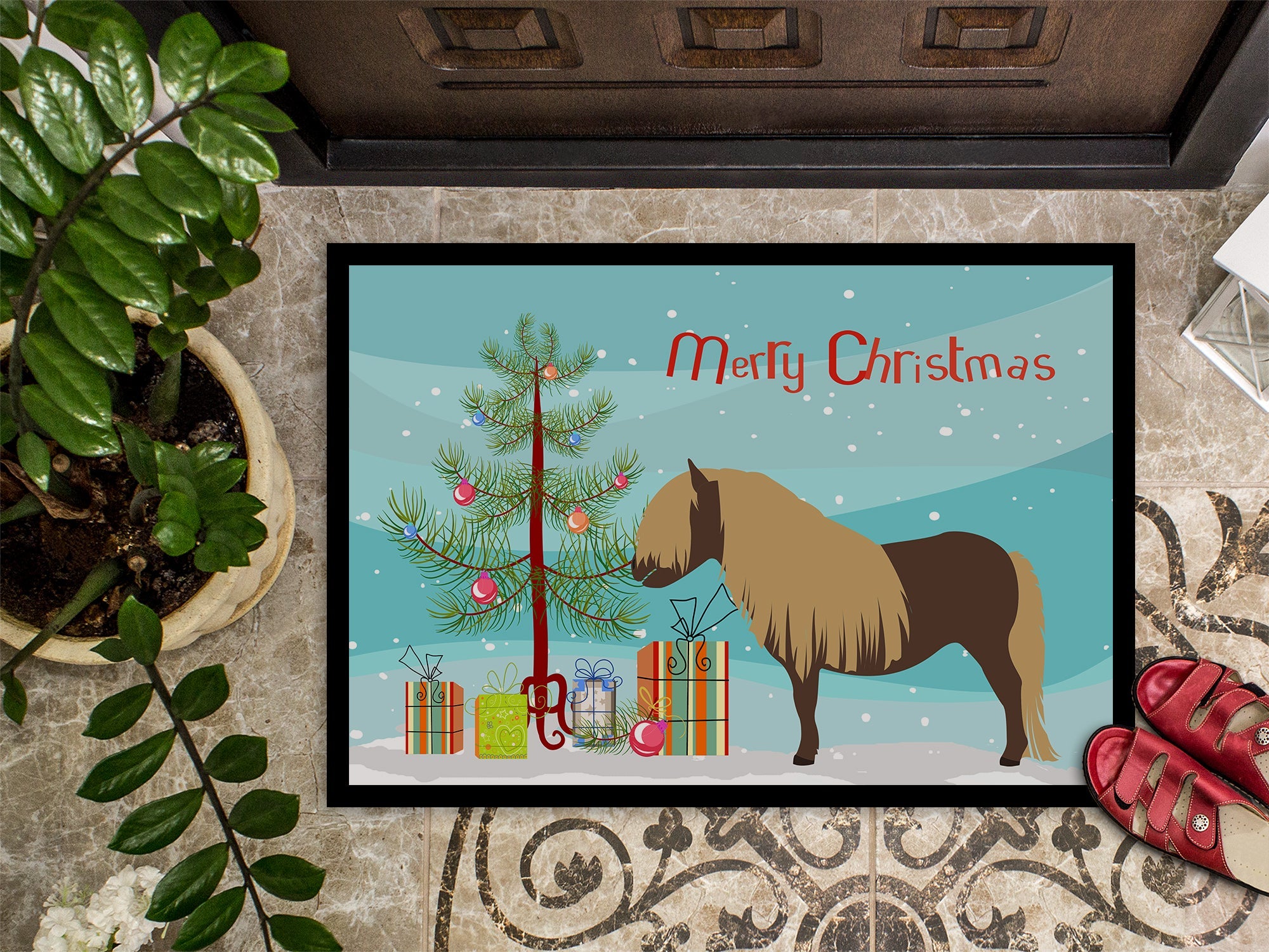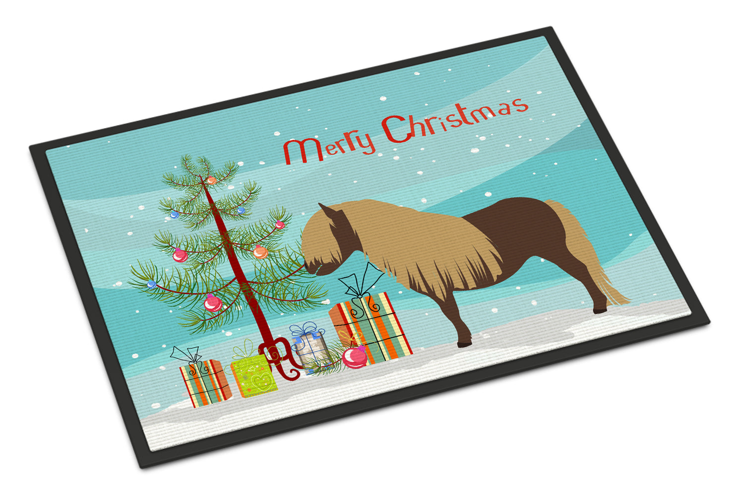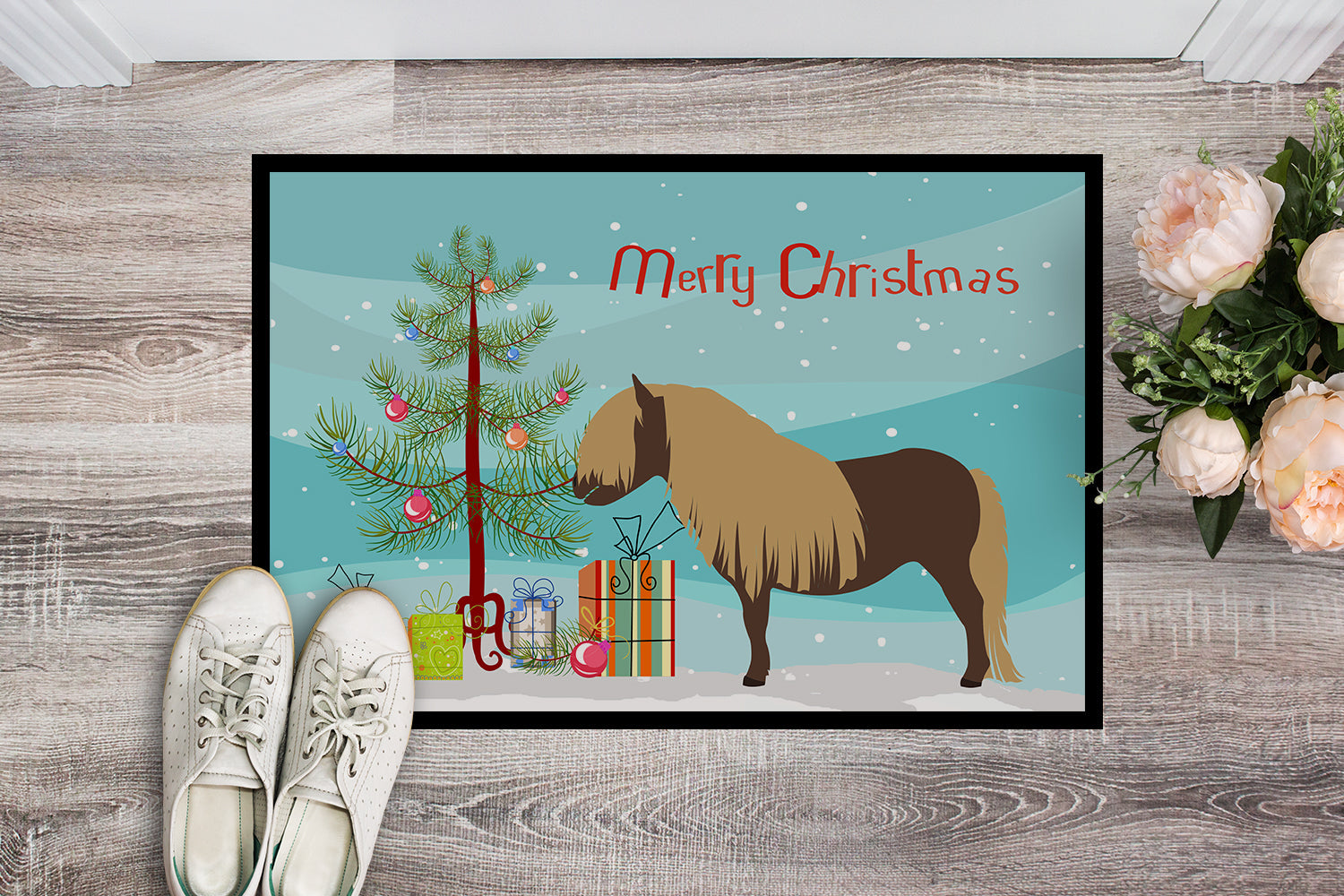 Decorate your space with our Christmas Shetland Pony Horse artwork on a Doormat. Welcome your guests in style with our Artwork Door Mat, designed to withstand almost any weather condition. This mat, measuring approximately 18 by 27 inches, is held together by durable black binding tape. Its top layer, composed of polyester felt, is dyed with the eye-catching image you see on the mat. A few layers below provide the mat with stability, while its rubber bottom is stamped to help prevent slipping and ensures safety. Our mat works wonderfully as both an indoor or outdoor door mat. For cleaning, simply hose it off with water or use a power washer - no need for any cleaner that produces suds. Avoid scrubbing with a brush, instead, opt for the vacuum on floor setting. Designed manufactured and printed in the USA, this mat is a perfect addition to your porch, outdoor kitchen, entryway, or any indoor space. Its unique design makes it a charming decorative rug that greets your guests and adds a stylish touch to your home decor.
