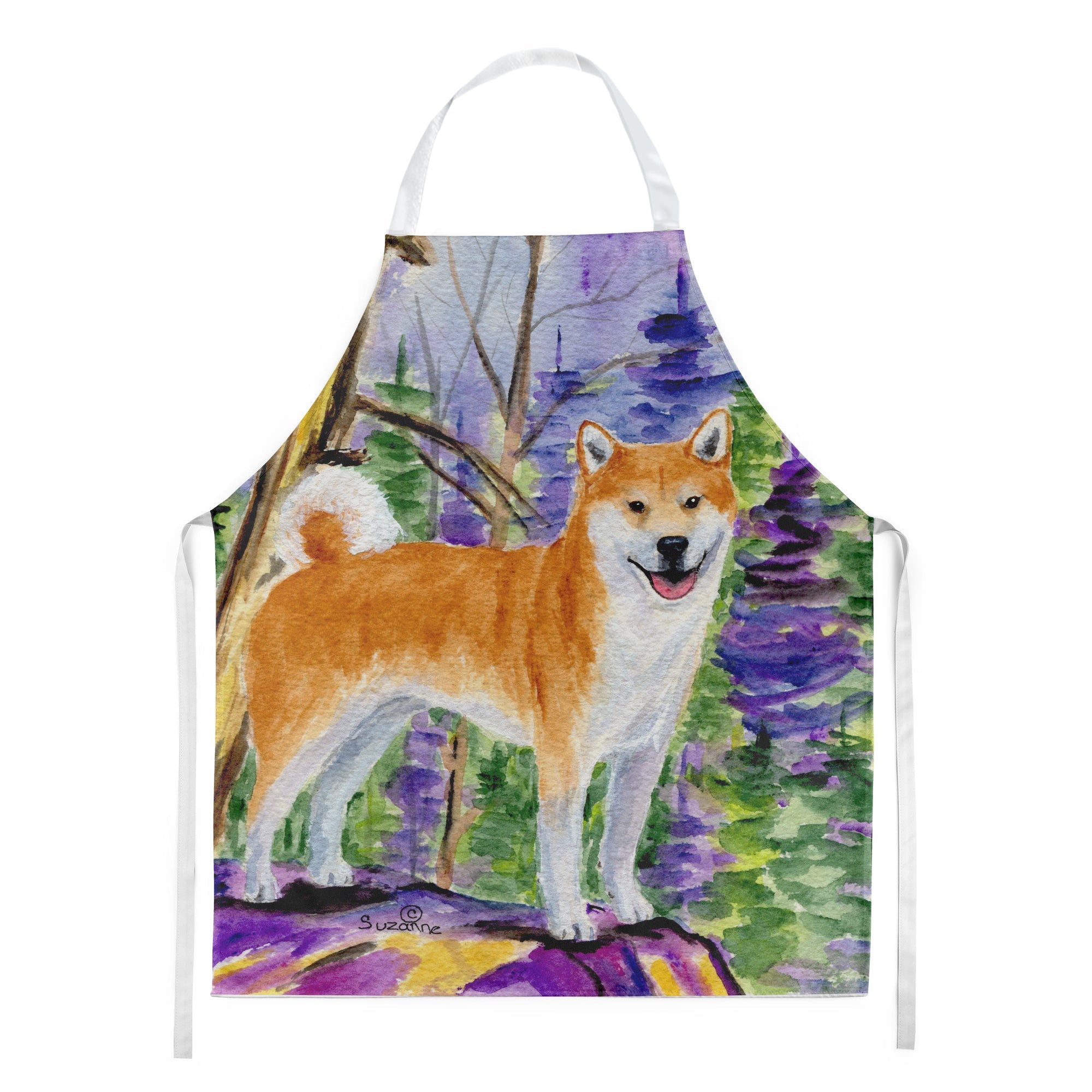 Decorate your space with our Shiba Inu artwork on a Apron. Elevate your cooking, baking, and grilling experiences with our versatile Kitchen or BBQ Apron. This Bib Style apron isn't just limited to culinary activities - it also serves as an excellent baking apron, artist apron, server apron, gardening apron, or even a dog grooming apron. The apron showcases vibrant full-color artwork contributed by one of our talented artists, bringing a dash of style to your daily tasks. With dimensions of approximately 27"W x 30"H, it provides ample coverage to protect your clothing from spills and splashes. Our apron is meticulously crafted from 100% Ultra Spun Polyester, known for its durability and lightweight nature. The apron comes with white tie straps, ensuring a comfortable and adjustable fit for all. It's a perfect choice for kitchen apron enthusiasts, whether you are a woman or a man. Designed for easy maintenance, this apron is fully machine washable. The quick-drying polyester material actively reduces staining, keeping your apron looking fresh and new for longer. Our beautifully designed apron isn't just a functional kitchen accessory - it's a fashion statement in the culinary world!