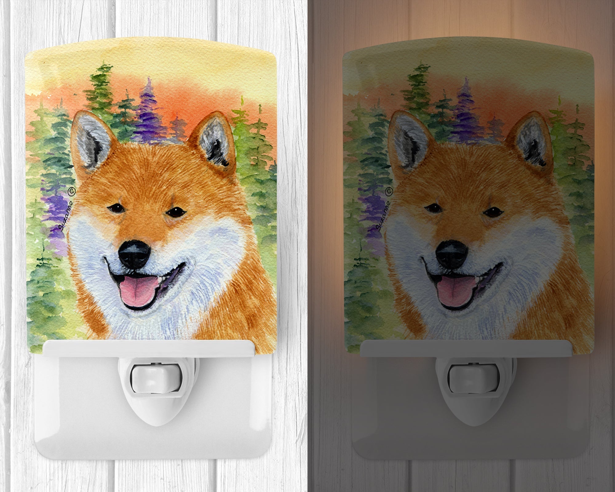 Decorate your space with our Shiba Inu artwork on a Night Light. Introduce a splash of artistic flair and subtle illumination to your space with the Decorative Ceramic Night Light from Caroline's Treasures. Perfect for any room, this night light seamlessly blends functionality with an aesthetic appeal, offering a stylish solution to brighten up dark corners of your home or office. Boasting a six-inch high by four-inch wide ceramic tile at the front, it showcases vivid, full-color artwork from distinguished artists, transforming a simple utility into a vibrant art piece. The artwork is securely encased in a robust metal holder, ensuring durability and longevity. Two screws are provided to firmly affix the tile into the holder. The holder extends three inches deep, housing an included bulb that emits a soft, welcoming glow. This product meets all safety standards, as evidenced by its UL approval. Proudly made in the United States from imported components, this Decorative Ceramic Night Light is not just a functional device; it's a statement piece that enhances the ambiance of your surroundings.