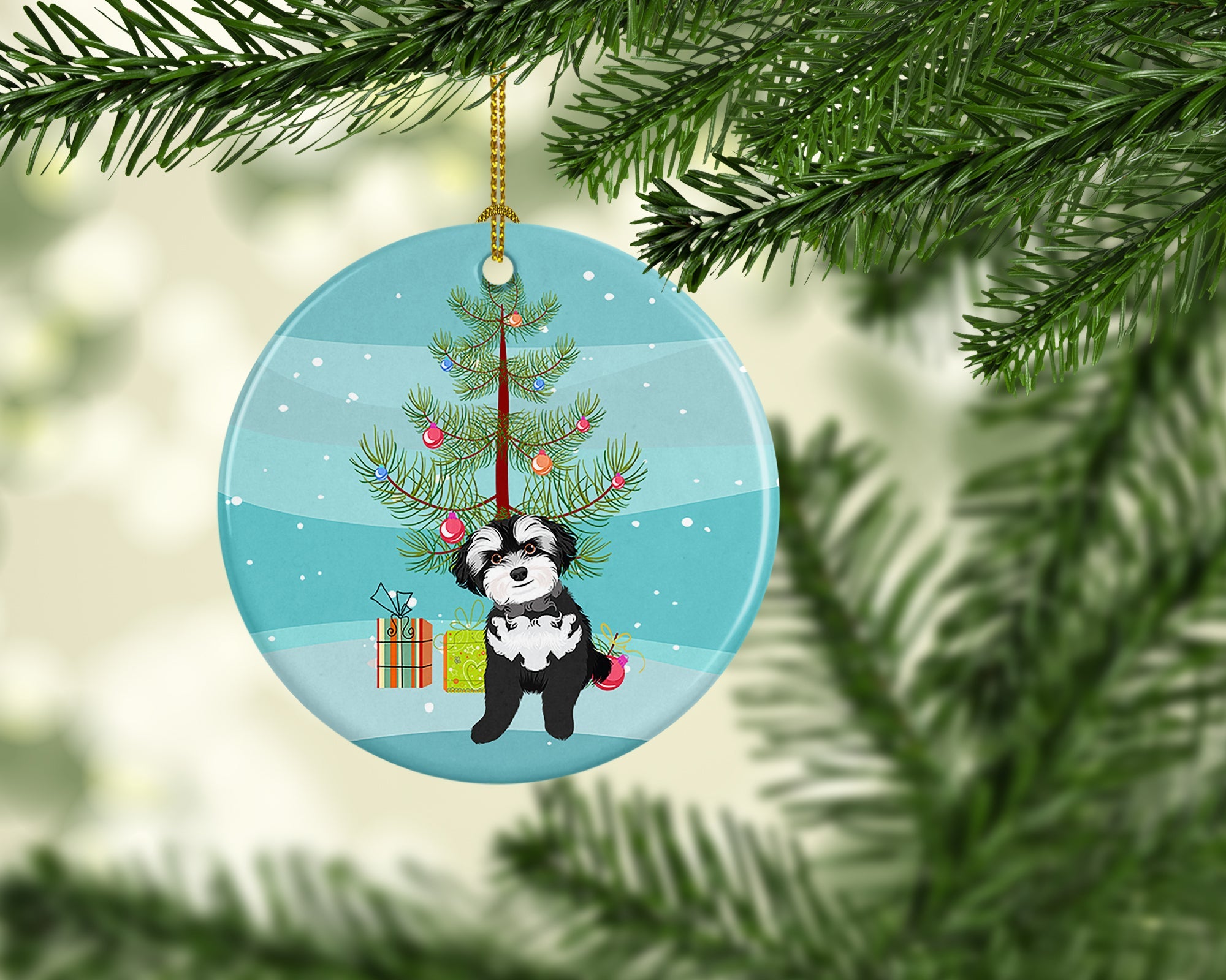 Ceramic Ornament featuring breed specific Shih Tzu artwork. Celebrate Christmas with this Christmas Ornament. Add a touch of personalized charm to your Christmas tree this holiday season with our Ceramic Ornament. Measuring 2.8125 inches in diameter, this round porcelain ornament beautifully reflects your festive lights, enhancing your holiday decor. The gloss surface sets off the vibrant, full-color artwork contributed by one of our talented artists, bringing a pop of color and joy to your tree. This Ceramic Ornament doesn't stop at being merely decorative. The white back is designed for personalization. Write a heartfelt message, mark a special year, or inscribe a date with a paint pen or a permanent marker to create a treasured memento. Please ensure you allow any personalization to dry thoroughly before handling to maintain the pristine finish. Included with the ornament is a delicate gold cord for easy hanging. Made in the USA, this Ceramic Ornament makes an exceptional gift for a pet sitter, teacher, family member, or anyone you wish to share a little Christmas magic with. With its blend of style, charm, and personal touch, it's a meaningful addition to any Christmas tree.