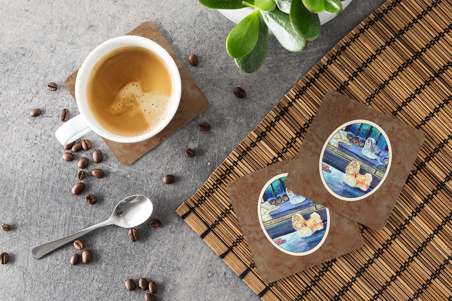 Decorate your space with our Shih Tzu artwork on a Coaster set. Presenting our Set of 4 Foam Coasters, a stylish and practical addition to your table setting. Each square coaster, measuring 3 1/2 inches by 3 1/2 inches, is perfectly sized to accommodate various drinkware, from coffee mugs to tumblers. These coasters stand out with their full-color artwork, permanently dyed onto the material for a vibrant and fade-resistant finish. They're not just functional, they're a fashionable statement, adding a touch of flair to any gathering or event. Our foam coasters serve a dual purpose - they protect your table from water stains and are perfect for both hot and cold drinks. The material used is similar to that of our high-quality mouse pads, ensuring durability and heat resistance. These coasters are easy to maintain - simply wash them in the top of your dishwasher and lay flat to dry. The design won't come off, ensuring they retain their vivid colors for years. Pair them with one of our insulated coolers or huggers for a cohesive, thoughtful gift set. Enhance your beverage experience with our Set of 4 Foam Coasters.