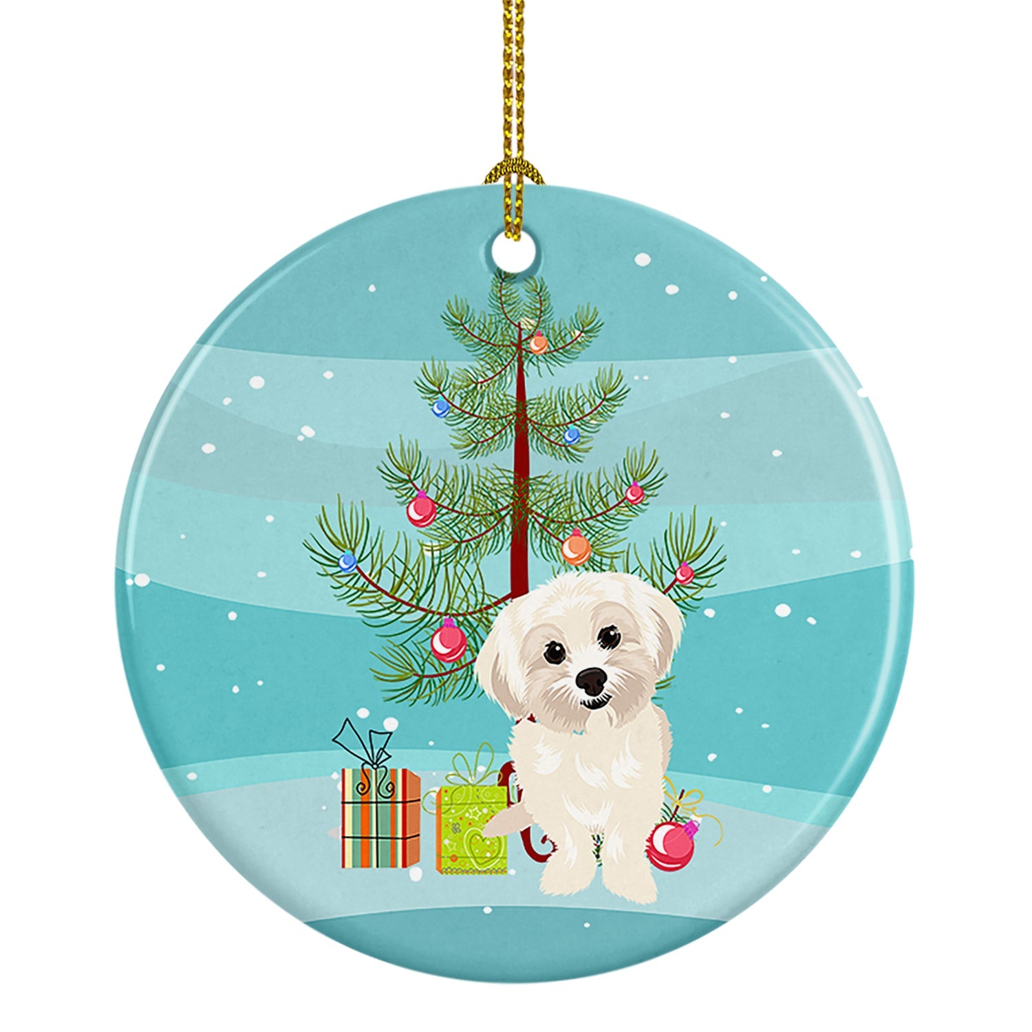 Ceramic Ornament featuring breed specific Shih Tzu artwork. Celebrate Christmas with this Christmas Ornament. Add a touch of personalized charm to your Christmas tree this holiday season with our Ceramic Ornament. Measuring 2.8125 inches in diameter, this round porcelain ornament beautifully reflects your festive lights, enhancing your holiday decor. The gloss surface sets off the vibrant, full-color artwork contributed by one of our talented artists, bringing a pop of color and joy to your tree. This Ceramic Ornament doesn't stop at being merely decorative. The white back is designed for personalization. Write a heartfelt message, mark a special year, or inscribe a date with a paint pen or a permanent marker to create a treasured memento. Please ensure you allow any personalization to dry thoroughly before handling to maintain the pristine finish. Included with the ornament is a delicate gold cord for easy hanging. Made in the USA, this Ceramic Ornament makes an exceptional gift for a pet sitter, teacher, family member, or anyone you wish to share a little Christmas magic with. With its blend of style, charm, and personal touch, it's a meaningful addition to any Christmas tree.