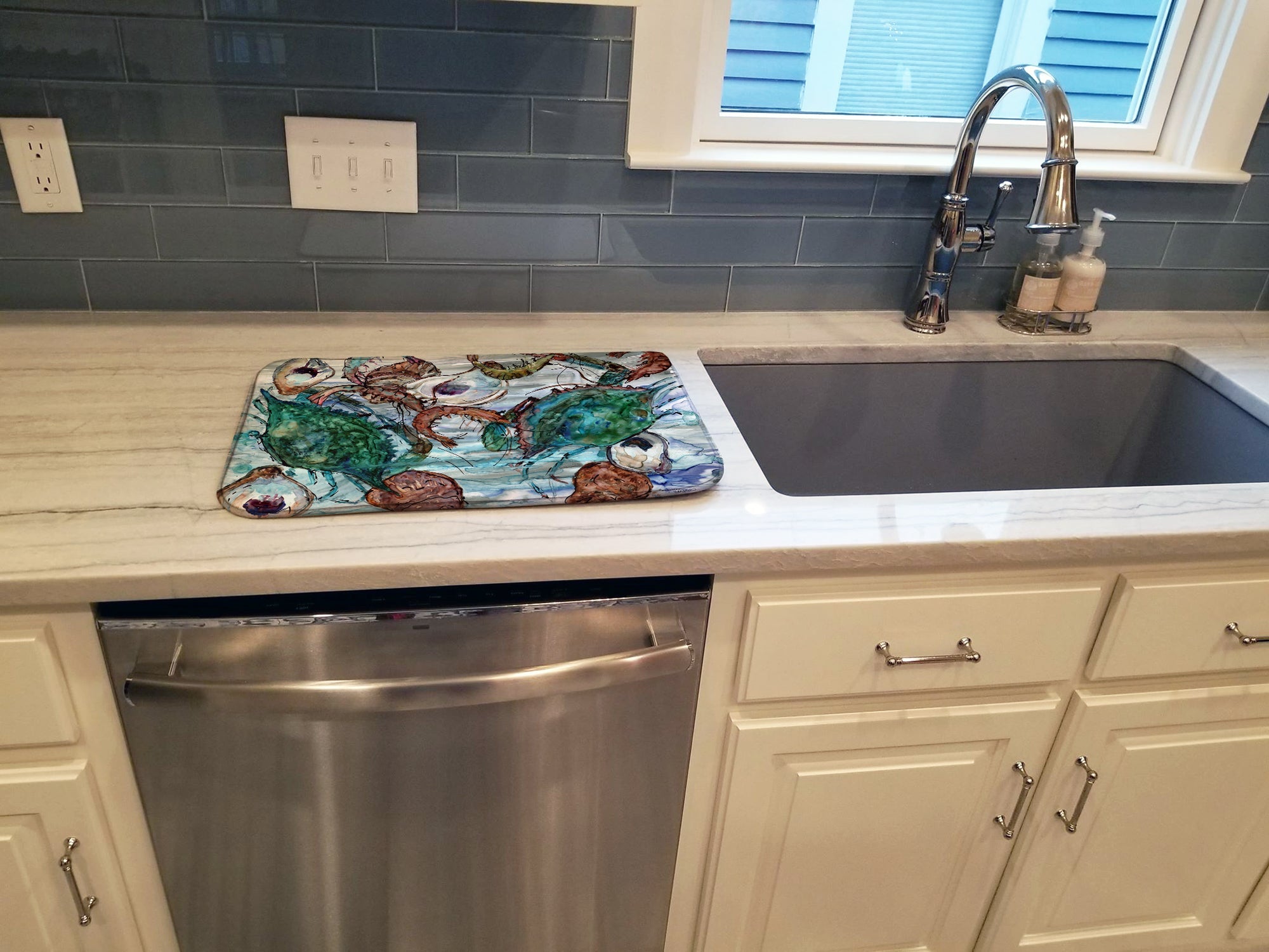 Say goodbye to messy countertops and soggy dish towels with our innovative dish drying mat. Our high-quality dish drying pad is designed to keep your countertops dry while offering a stylish and efficient solution. Whether you're air drying dishes, glasses, stemware, silverware, pots, pans, bottles, or even fruits and vegetables, our dish mat is the perfect choice. The 14 inches x 22 inches size fits most counters and dish drying racks, and the non-slip design ensures stability. Made with water-absorbent polyester and a polyurethane foam insert, our dish drying mat is not only functional but also durable. It's machine washable and printed in the USA for long-lasting use. The beautiful artwork adds flair to your kitchen decor, making it a perfect housewarming gift or present for any occasion. Upgrade your kitchen experience with our absorbent and versatile dish drying mat.
