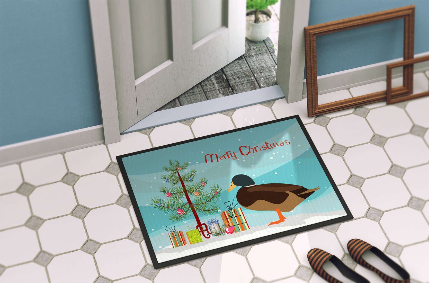 Decorate your space with our Christmas Silver Bantam Duck artwork on a Doormat. Welcome your guests in style with our Artwork Door Mat, designed to withstand almost any weather condition. This mat, measuring approximately 24 by 36 inches, is held together by durable black binding tape. Its top layer, composed of polyester felt, is dyed with the eye-catching image you see on the mat. A few layers below provide the mat with stability, while its rubber bottom is stamped to help prevent slipping and ensures safety. Our mat works wonderfully as both an indoor or outdoor door mat. For cleaning, simply hose it off with water or use a power washer - no need for any cleaner that produces suds. Avoid scrubbing with a brush, instead, opt for the vacuum on floor setting. Designed manufactured and printed in the USA, this mat is a perfect addition to your porch, outdoor kitchen, entryway, or any indoor space. Its unique design makes it a charming decorative rug that greets your guests and adds a stylish touch to your home decor.