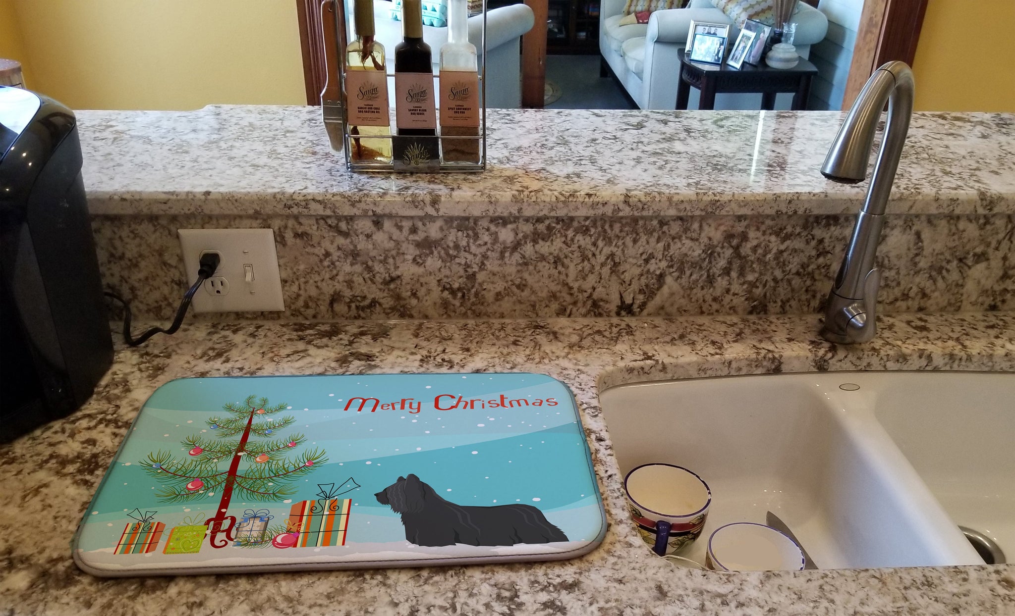 Decorate your space with our Christmas Skye Terrier artwork on a Dish Drying Mat. Say goodbye to messy countertops and soggy dish towels with our innovative dish drying mat. Our high-quality dish drying pad is designed to keep your countertops dry while offering a stylish and efficient solution. Whether you're air drying dishes, glasses, stemware, silverware, pots, pans, bottles, or even fruits and vegetables, our dish mat is the perfect choice. The 14 inches x 22 inches size fits most counters and dish drying racks, and the non-slip design ensures stability. Made with water-absorbent polyester and a polyurethane foam insert, our dish drying mat is not only functional but also durable. It's machine washable and printed in the USA for long-lasting use. The beautiful artwork adds flair to your kitchen decor, making it a perfect housewarming gift or present for any occasion. Upgrade your kitchen experience with our absorbent and versatile dish drying mat.