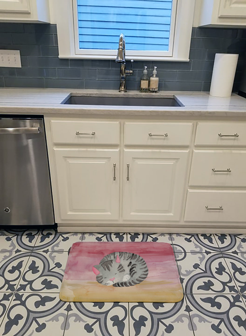 Sleeping Grey Cat Watercolor Machine Washable Memory Foam Mat BB7353RUG