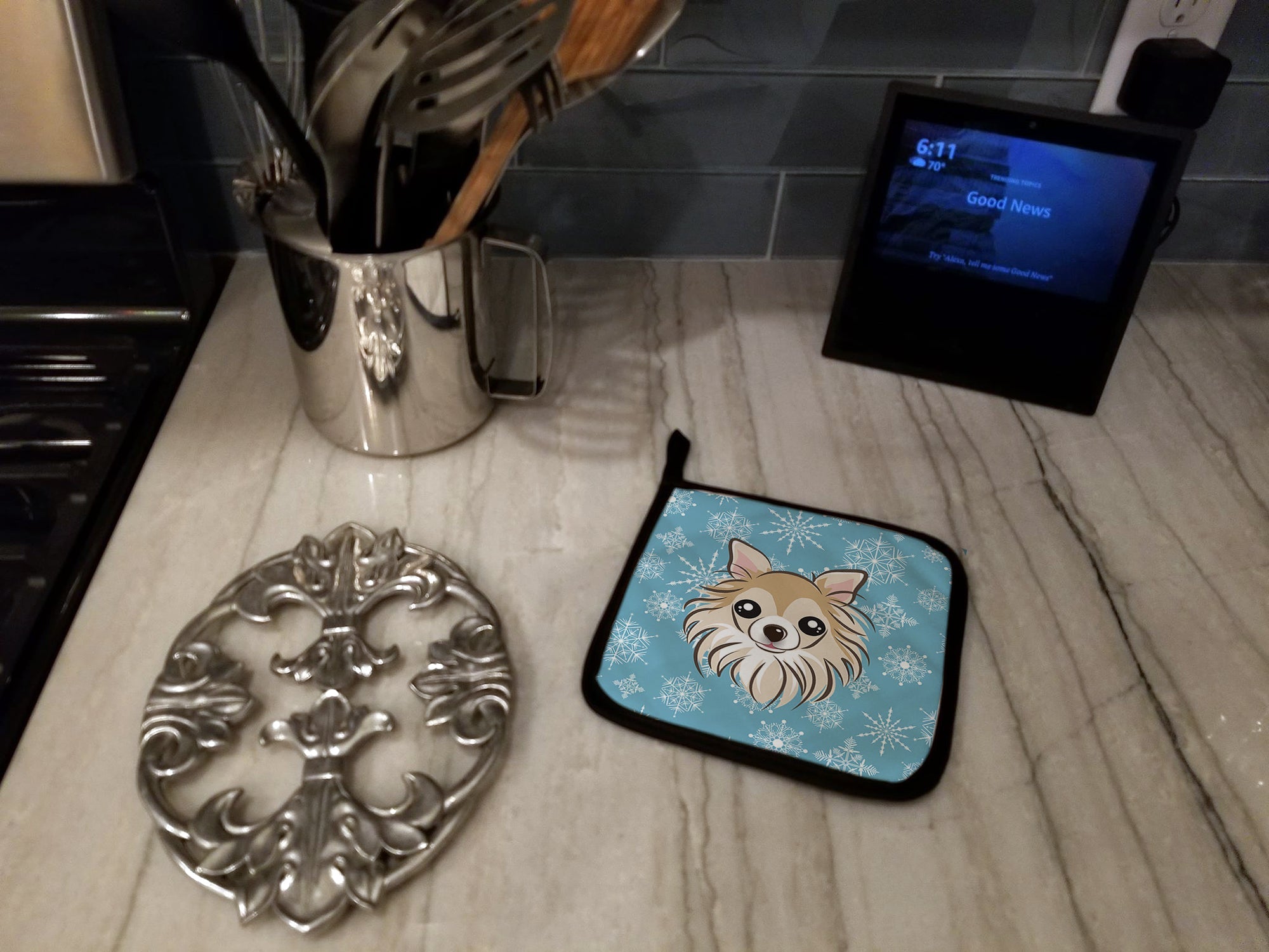 Decorate your space with our Christmas Chihuahua artwork on a Pair of Pot Holders. A Pair of Pot Holders to match your kitchen decor. Made in the USA these are thick and functional. Full color artwork decorates the front polyester fabric of the hot pad and accented by a black trim. Use these at as a trivet for your Thanksgiving or Christmas tablescape. Filled with insulated fabric and quilted for durability. These colorful pot holders will make a great gift for your favorite home cook or executive chef. Each pot holder measures approximately 7 1/2 inches by 7 1/2 inches. A hanging tab is included.