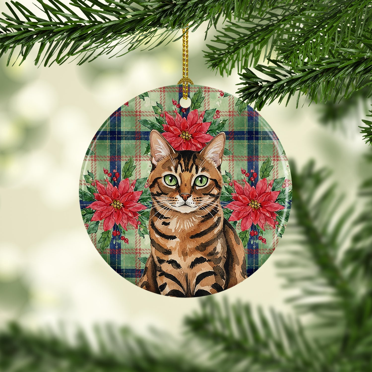 Spotted Tabby Brown Cat with Poinsettias Ceramic Ornament