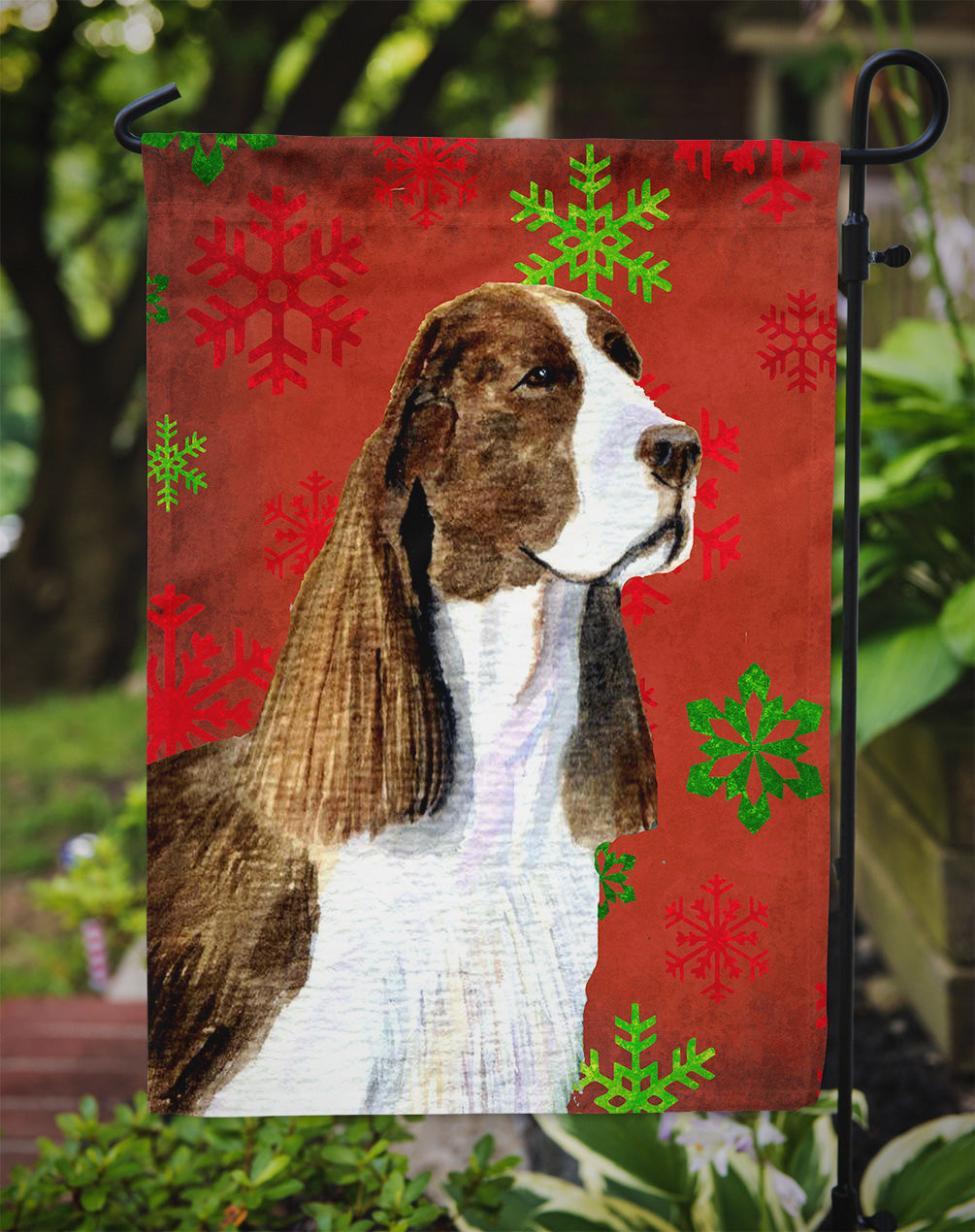Springer Spaniel Red and Green Snowflakes Holiday Christmas Garden Flag – Decorative Outdoor Yard Flag