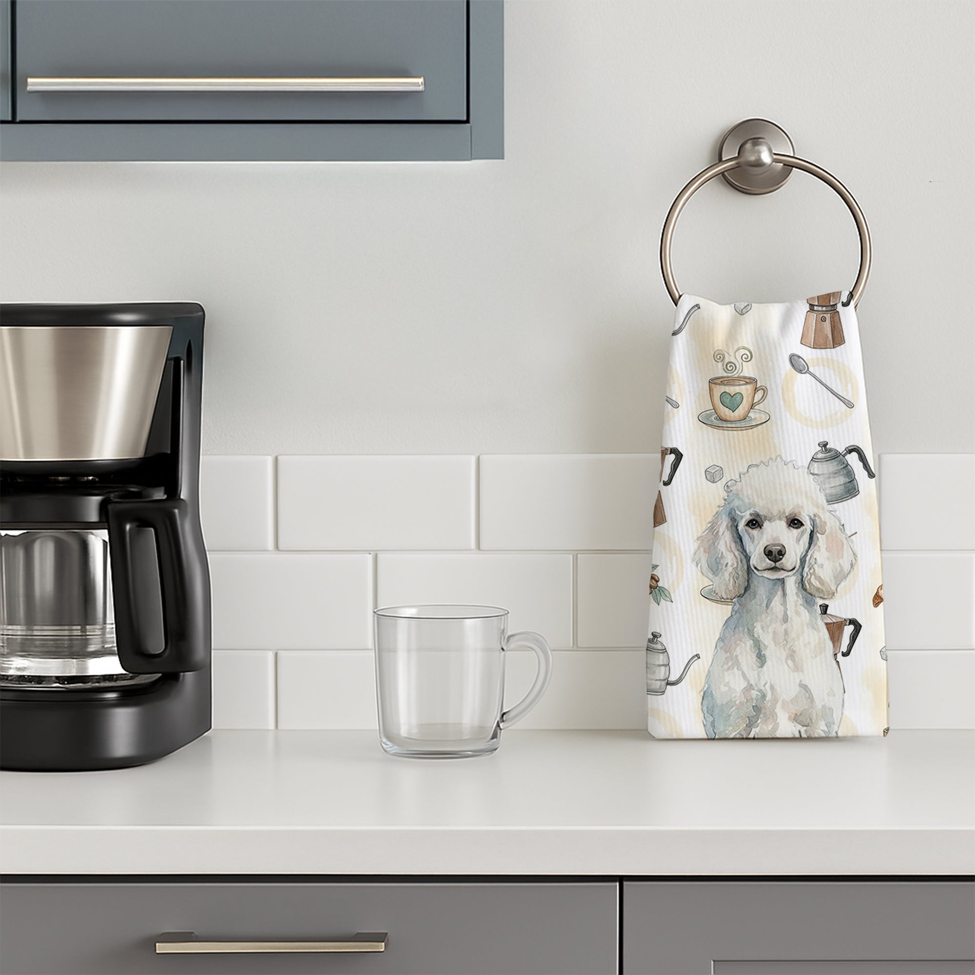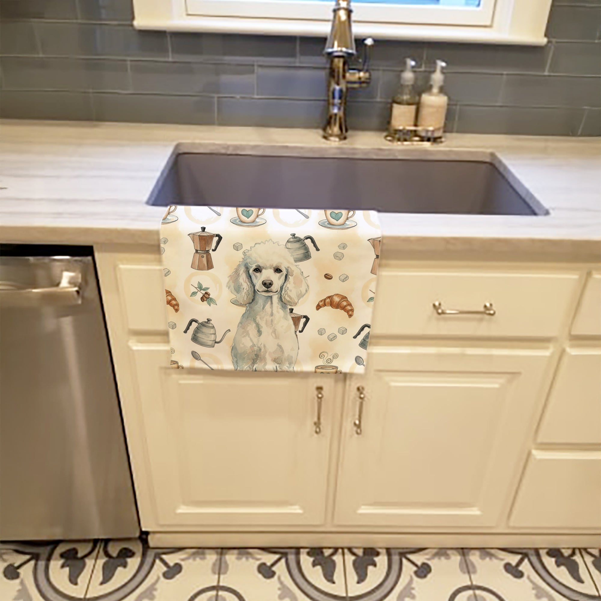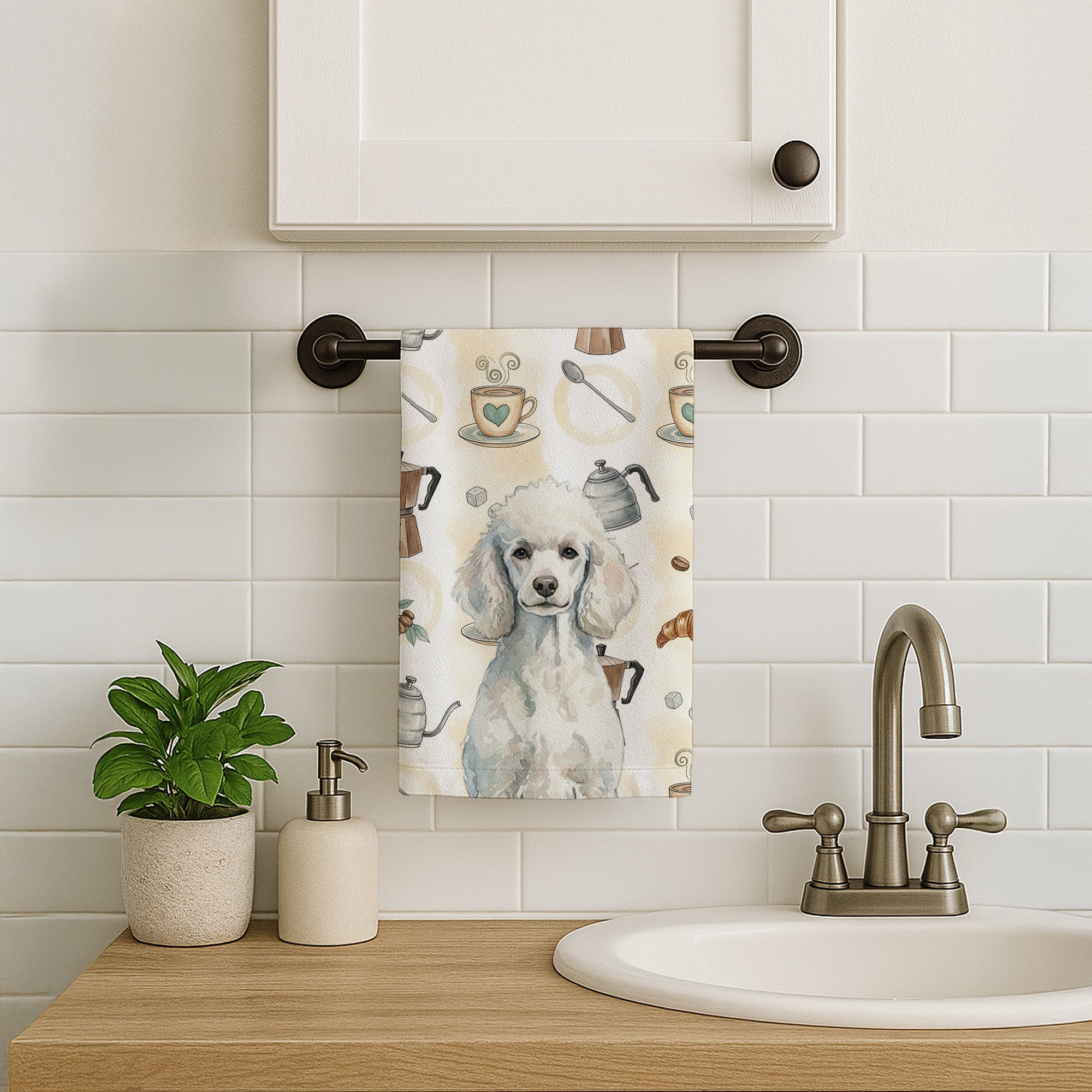 Kitchen Towel featuring breed specific Poodle artwork. Start your morning with charm and function thanks to our Coffee Time Kitchen Towel Collection. Featuring playful watercolor artwork of coffee pots, cups, croissants, and a dog portrait, these towels bring warmth and personality to your kitchen or bath. Crafted with a plush minky polyester front that polishes glassware to a shine, and a 100% cotton terry loop back for absorbency, they combine durability with practicality. Artwork is permanently dyed into the fibers to keep colors fresh wash after wash. Measuring 15" x 25", these machine-washable towels are finished with bound edges to hold their shape. Designed and printed in the USA, they’re perfect for kitchens, coffee bars, guest baths, or as thoughtful gifts for dog lovers and coffee enthusiasts alike.